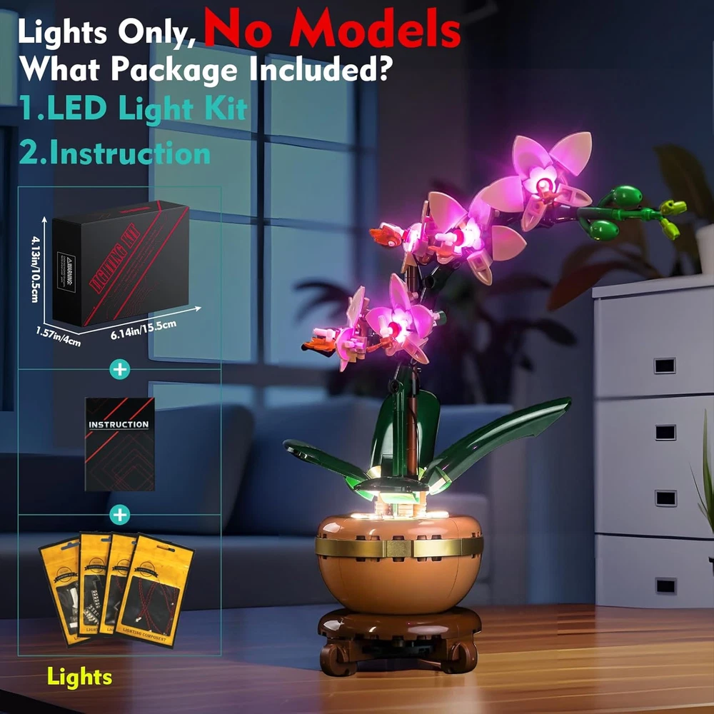 【NO MODEL BUILDING SET】ONLY THE LIGHT KIT FOR SALE, MODEL NOT INCLUDED. This LIGHTING KIT is specially compatible with LEGO Mini Orchid 10343. MODELS SET Need to be Purchased Separately or Already Owned by Yourselves. 【LIGHT UP YOUR BLOCKS】Light up corners of the model with gleam, intense lights, you can see the vivid details inside and outside, lights compatible with LEGO Mini Orchid 10343 make blocks glow in the dark. A special arrangement for Fans & Family collections. 【STEP-BY-STEP INSTALLATION】Provide detailed video/PDF installation instructions(Online) and step-by-step numbered light bags. Just disassemble a few bricks to install the light fixtures! Parts small and not fragile, DON'T pull wires too hard. 【MULTIPLE PLAY】 Light kit Compatible with LEGO Mini Orchid 10343 can be powered by USB (Voltage less than 5V). The lights will be brighter when powered by USB. Please test each light part before assembling. 【QUALITY GUARANTEE】Lighting set compatible with Mini Orchid 10343 is made of high-quality copper lines and ABS plastic, quality check, can be perfectly hidden & Compatible with LEGO blocks. If have questions withe product, please Let us know anytime. Product description The video showcases the product in use. The video guides you through product setup. The video compares multiple products. The video shows the product being unpacked. Are LEGO models included in the Package? No, the package does not contain any lego models or bricks. The model in the image is only used as a demonstration of the lamp accessory effect and is not included in the package. The model needs to be owned by the customer. What should I do after receiving the product package? First, please follow the Online tutorial in the manual to check the lights for completeness & test each lights for proper functioning before installing, then patiently follow the instructions step-by-step to install the lights onto the model. What should I do if I have problems using and installing the light kit? Please let Our Store know when you need it no matter what, we will reply to the doubt and arrange for the replacement of the parts you need.