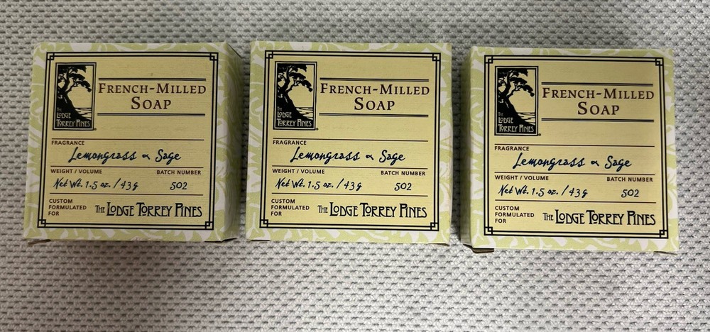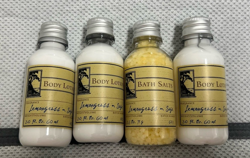 New-unused Includes: 3 Lemongrass & Sage body lotion 1 Lemongrass & Sage bath salts 3 Lemongrass & Sage French milled soap bars 1 Torrey Pines shoe mitt 1 Torrey Pines heel horn Custom formulated for The Lodge Torrey Pines **Feel free to contact me with any questions 🙂