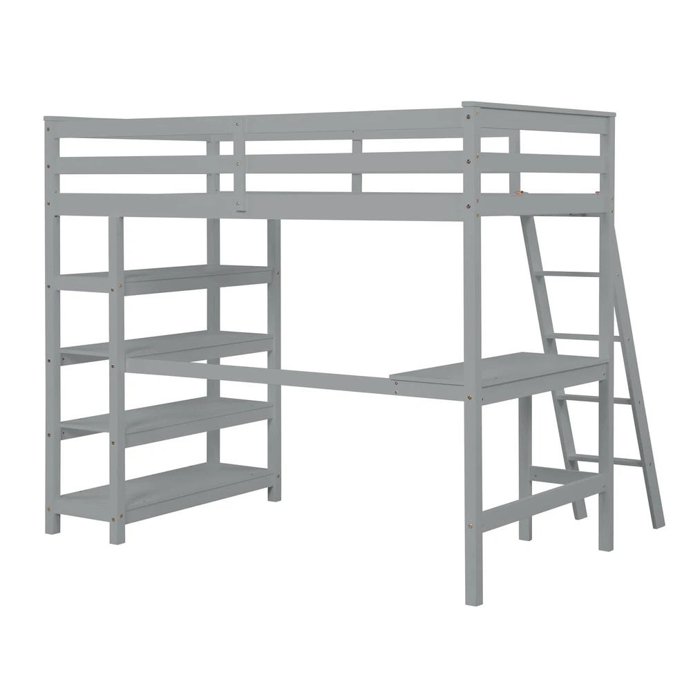 Loft Bed Twin with desk,ladder,shelves ,GreyThe loft bed combines bedroom and study into a cozy and lovely space, below the upper bunk there are a built-in desk and crosswise shelves on the other end ,which make kids to do homework and get books and daily items from the 4-shelf storage stand very conveniently. The shelves stand also can display anything lovely and keep your bedroom neat and concise , making this loft bed to show outstanding centrepiece to any bedroom. The inclined ladder on the upper bed adds plenty fun and exercise to kids when they get up to bed, instantly the exquisite study is turned into a warm sleeping nest .DescriptionProduct TypeLoft Bed with Desk,ShelvesSizeTwinColorGreyMaterial (main)Pine + Plywood+PBNumber of SlatsBed: 14 pcsSpring BoxNo needAssembly Free Shipping Over $49.99* Details Loft Bed Twin with desk,ladder,shelves for bedroom, Grey Product Description: Loft Bed Twin with desk,ladder,shelves ,Grey The loft bed combines bedroom and study into a cozy and lovely space, below the upper bunk there are a built-in desk and crosswise shelves on the other end ,which make kids to do homework and get books and daily items from the 4-shelf storage stand very conveniently. The shelves stand also can display anything lovely and keep your bedroom neat and concise , making this loft bed to show outstanding centrepiece to any bedroom. The inclined ladder on the upper bed adds plenty fun and exercise to kids when they get up to bed, instantly the exquisite study is turned into a warm sleeping nest . Description Product Type Loft Bed with Desk,Shelves Size Twin Color Grey Material (main) Pine + Plywood+PB Number of Slats Bed14 pcs Spring Box No need Assembly Required Yes Manual and Hardware Yes Technical Details Overall Product Dimension 79.7" x 63.4" x 68.3" Overall Product Weight 146.6 lbs Package Details Please refer to the Specification Bed Weight Capacity Bed200 lbs Suggested Mattress Thickness 6 inches or less