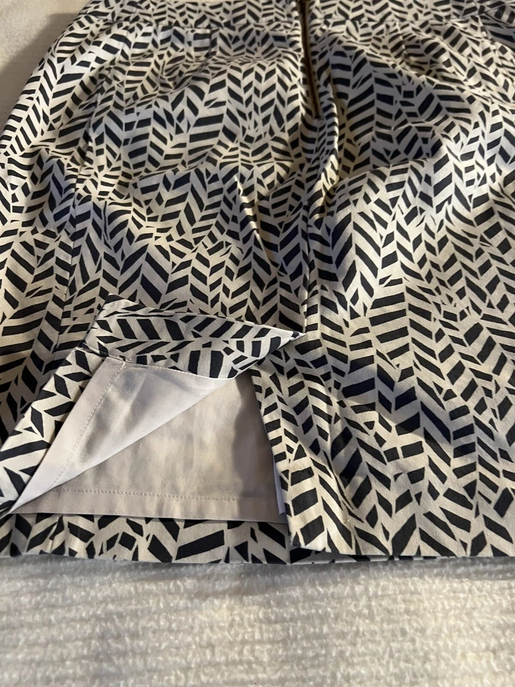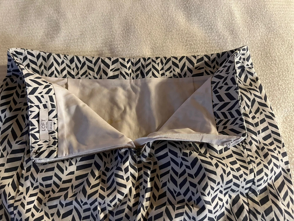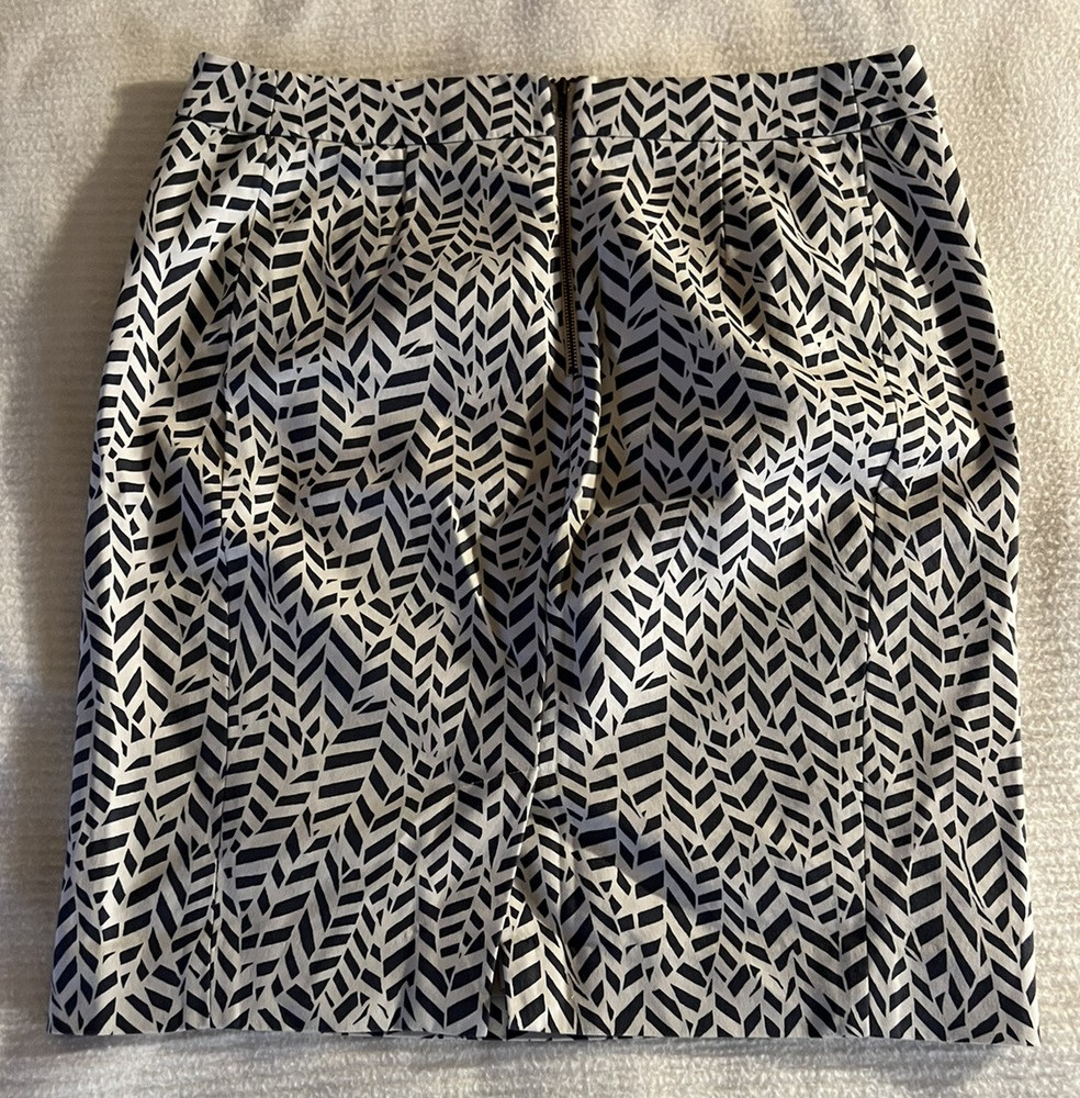 Loft Petites Abstract Skirt Size 10P. Cute abstract/geometric patterned skirt with slit in the back. About knee length, straight/pencil fit. In good condition but does have a small subtle stain on lower bottom in front, as seen in 4th picture. Not very noticeable. This item comes from a smoke free clean home. If you have any questions please ask away. All sales final. Thanks for shopping! :)