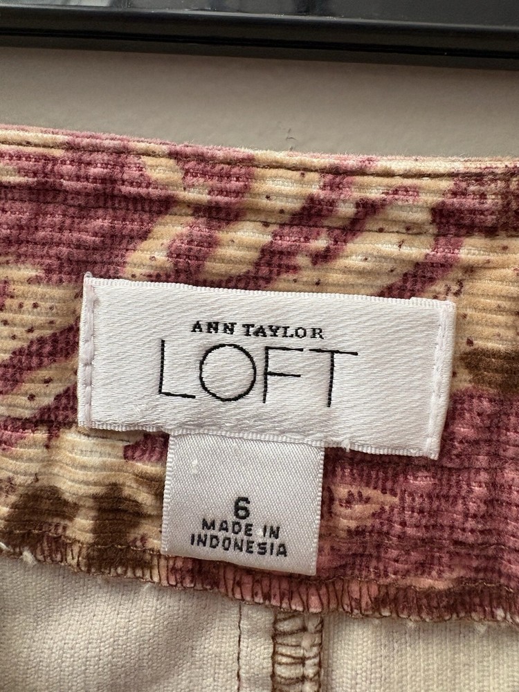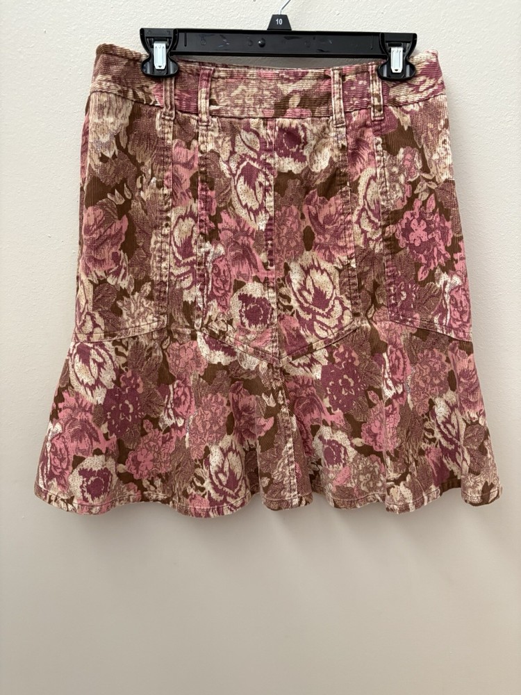 This Loft by Ann Taylor skirt is a size 6 A-line style in a brown and pink floral corduroy fabric. It features a zip and snap closure. The skirt has a feminine, cottagecore design with a touch of country charm, making it a versatile and stylish piece for your wardrobe.