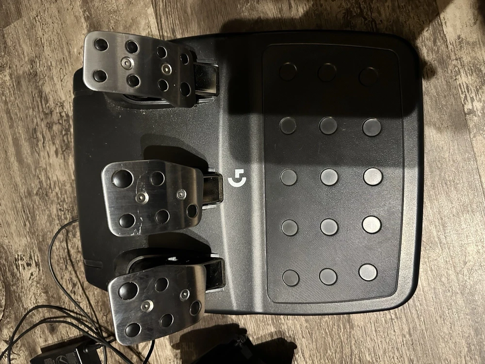 Logitech G G923 USB Steering Wheel + Pedals PC, Xbox - Black I’ve had it for a while but everything works box is in good condition there’s just a little wear on the wheel from resting it on the pedals to put away when not in use It does come with a shifter but it sometimes goes into R gear or 6th gear instead of going right into 6 gear it’s common for their shifters and should be an easy fix I just don’t have time to do it. Only selling because I want to upgrade