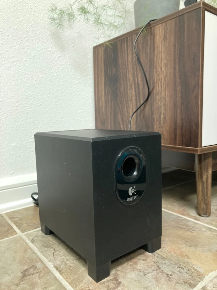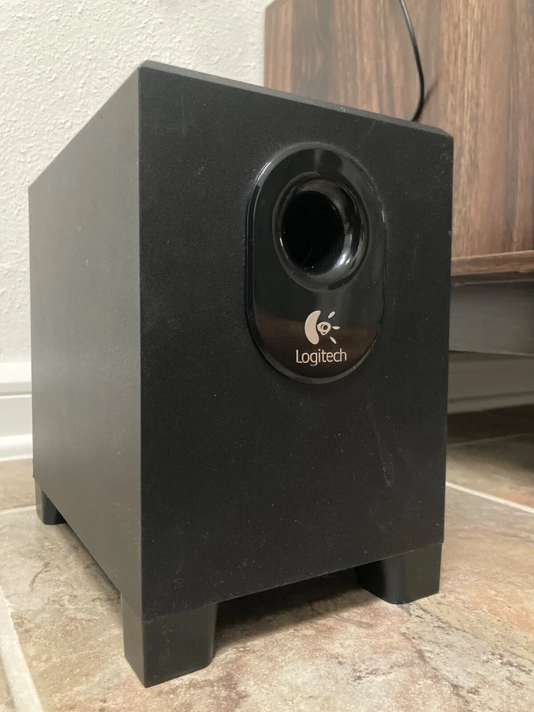 Pump up the volume with this set of Logitech X-240 Speakers. Accepting offers. 2.1 channel surround/satellite system comes with a subwoofer and supports THX and Dolby Digital surround sound formats. Plug the headphone jack into your projector (as shown) for an immersive movie experience. Rectangular-shape, black crystal material speakers function with a wide range of brands and models, making them versatile. Easy to set up and compatible with any 3.5mm jack. Plug into your laptop or MacBook’s headphone port or to your PC for the ultimate gaming experience. Bluetooth dongle included as shown in photos. (Compatible with iPhone) -Wired speakers -RMS power of 50 W -Audio inputs for AUX and a 3.5 mm jack. -Adjustable subwoofer power -Additional port for headphones with easy volume control and hideaway cellphone cradle Disclaimer: Used speakers and woofer, small crinkle at the base of subwoofer cone. Does not affect sound quality. Detachable wired speakers will come with subwoofer in padded box for safety.
