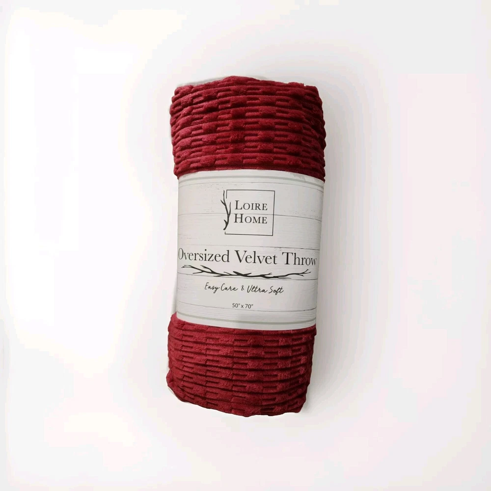 This is a luxurious Loire Home throw blanket in an oversized 50 x 70 inch size. Made from soft velvet material with a textured design, it is perfect for adding warmth and style to any bedroom decor.