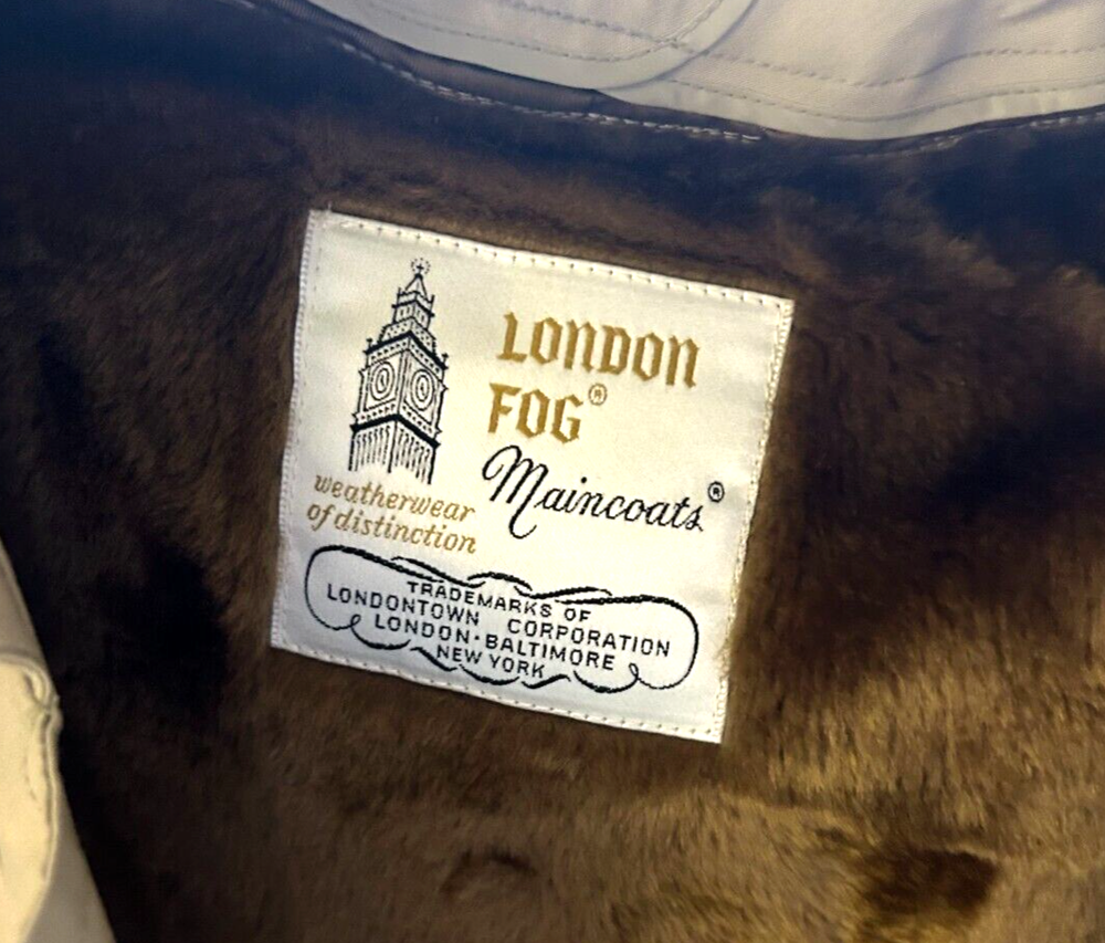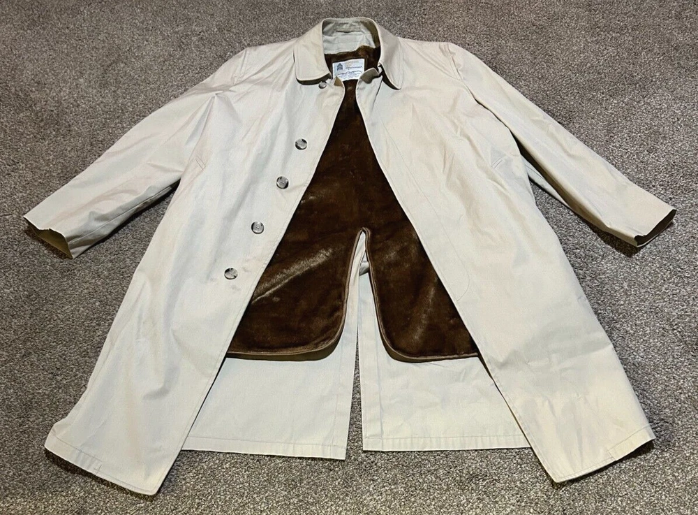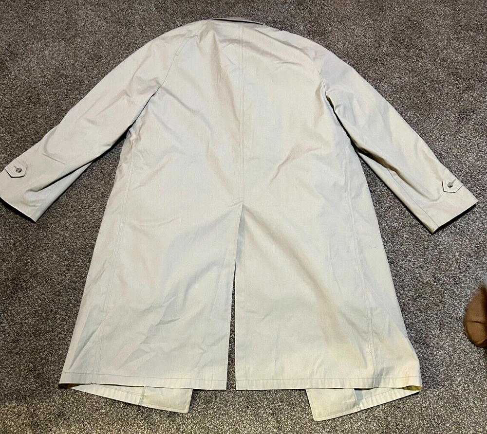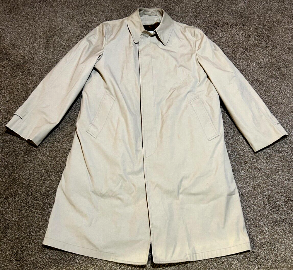 This London Fog Men's Winter Trench Coat in size 42 Long features a classic Vintage style with a Beige Solid color. Made of Polyester/Cotton blend fabric, it has a Polyester lining and a zip-out liner for versatile wear in Winter, Fall, and Spring. The five-button front and long length add a formal touch suitable for business, travel, weddings, parties, or casual occasions, making it a timeless and stylish outerwear option for men seeking a classic look with a vintage flair.