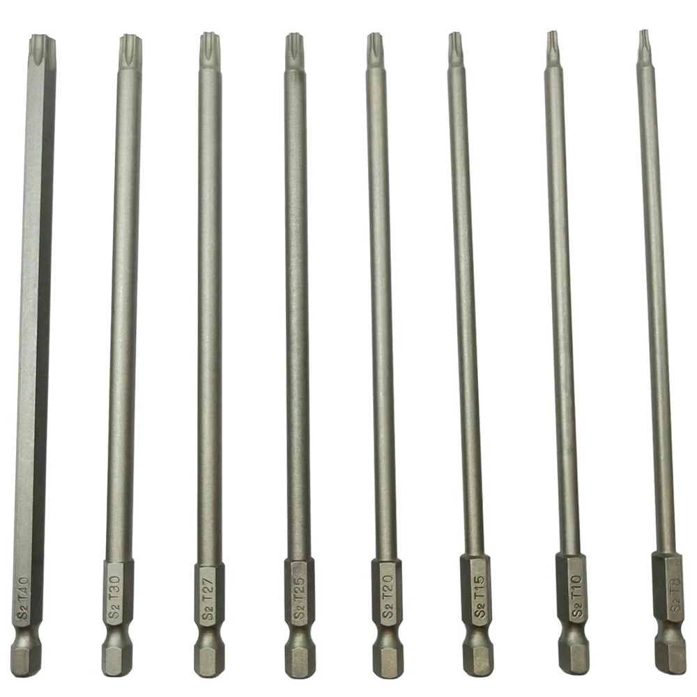 ✔【8 Size Torx Screwdriver Bits】T8, T10, T15, T20, T25, T27, T30, T40, 8 in 1 Professional Size long torx security driver bits set can meet your different needs. Size is clearly engraved on the shank for easy identification. ✔ 【Widely Application】1/4” inch hex shank, and 6 inch (150mm) length. Can be used with electric screwdriver, manual screwdriver, electric drill, group general tools, air drill and other any standard bit holders. ✔【S2 High Quality Steel】Made of S2 high quality shock-resisting tool steel, a hard and abrasion-resistant alloy metal. Torx head bits surface for steel material color,from inside to outside are the same. ✔【Magnetizable Head】Magnetizable torx security screwdriver bar(New Bits with Weak Magnetic). After Magnetized with a magnet it would with a strong magnetic, can suck the screws easily when used it. ✔【Exquisite Workmanship】This torx security tamper proof star bit set, exquisite workmanship, each edge can be accurately locked screws, no damage to the screw, and the screwdriver head.Such a practical aid in many situations.