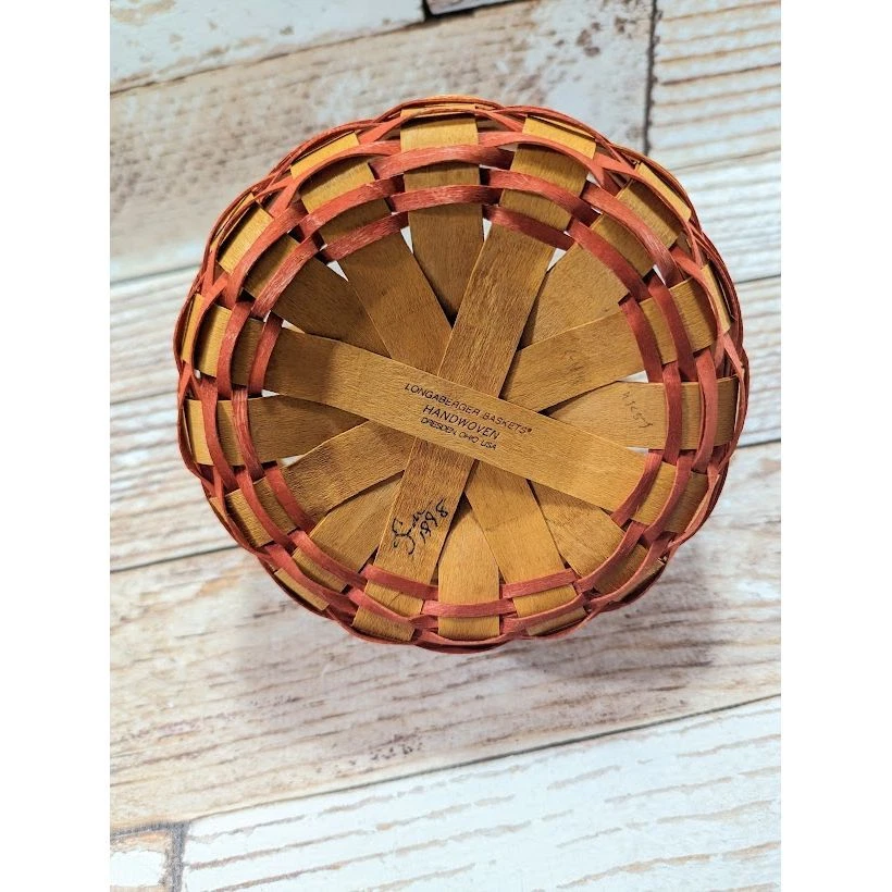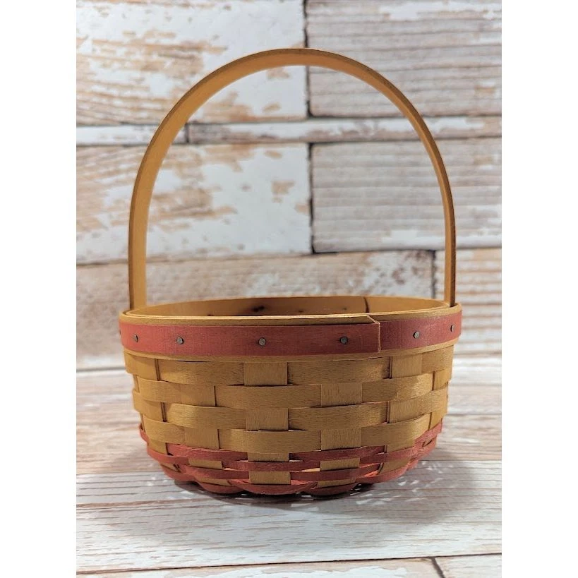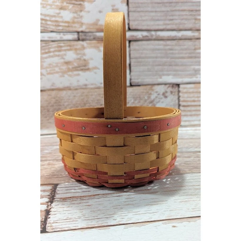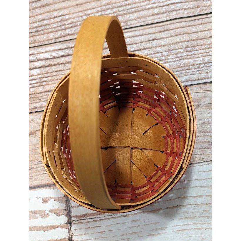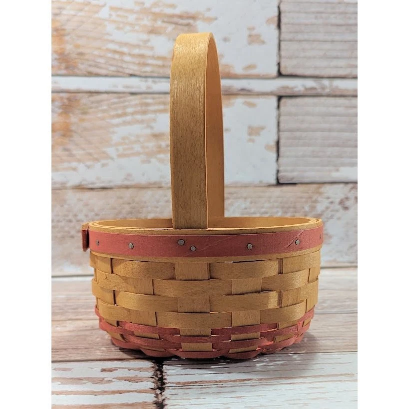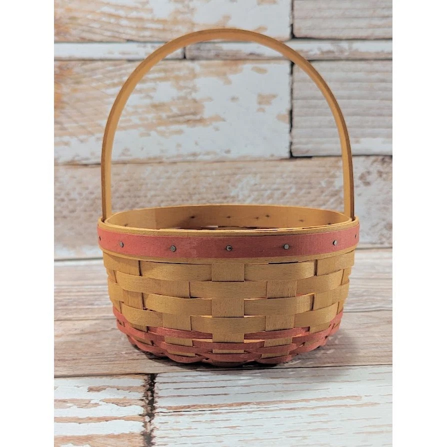 Longaberger 1998 Mother's Day Rings and Things Basket 7" x 3" with single stationary handle Right Handed Weaver From Smoke Free/Cat Friendly Home Keywords: wooden basket, handwoven basket, storage basket, decorative basket, round basket, handled basket, woven wood, rustic basket, farmhouse decor, organization, natural wood, red accent, home storage, Longaberger, Mother's Day, Ring and Things