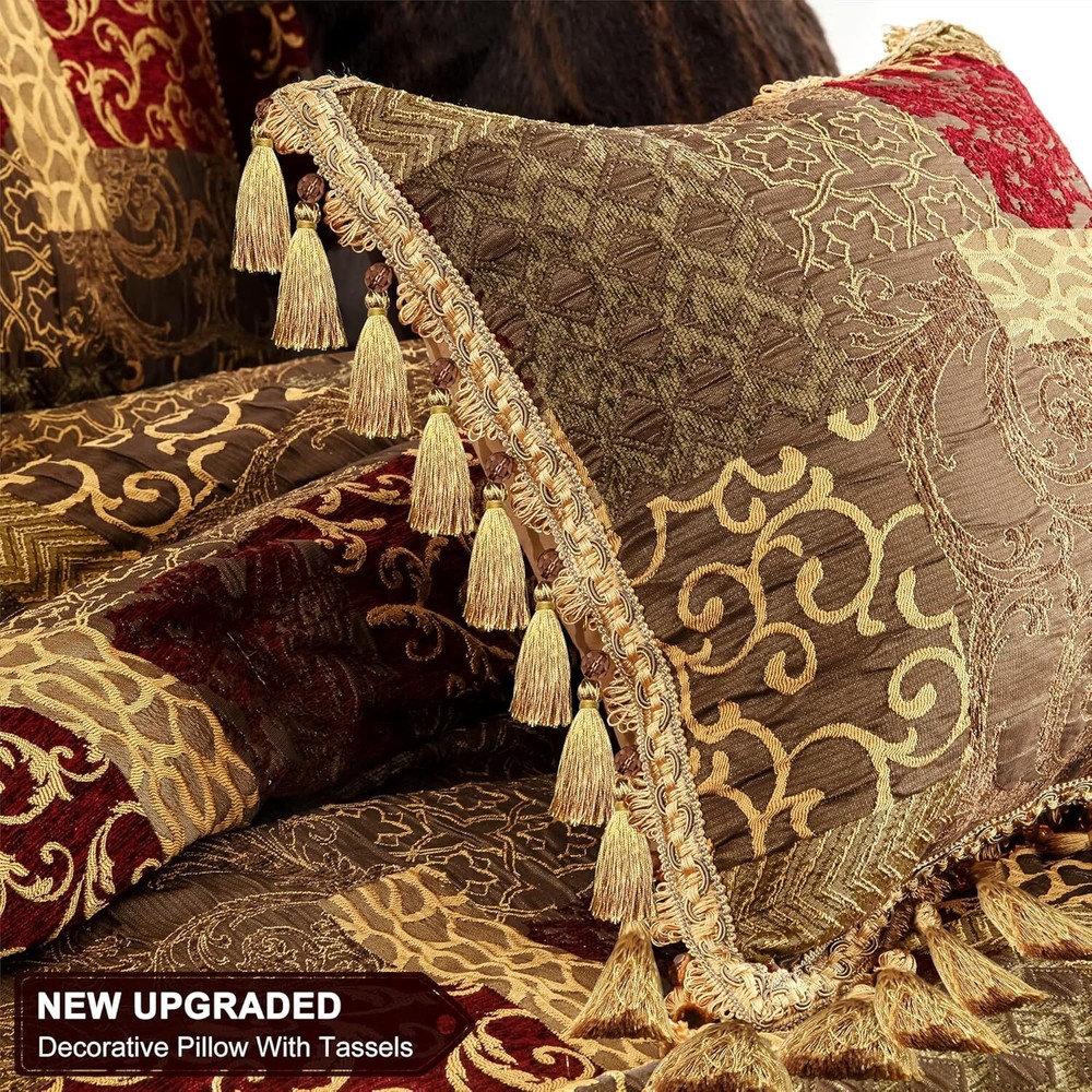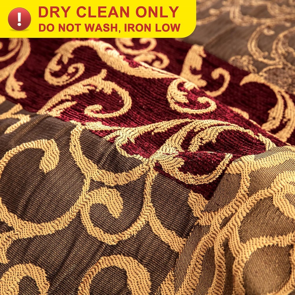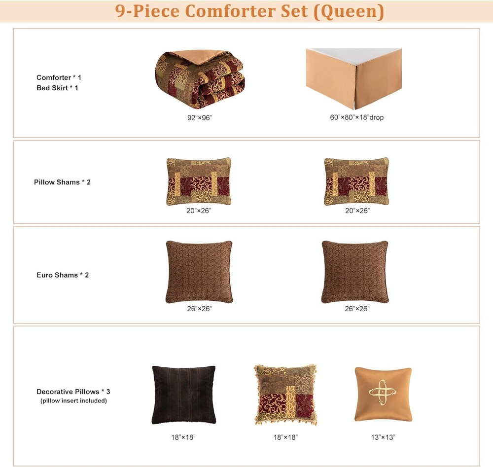 Loom and Mill 9-Piece Jacquard Comforter Set, Luxury Traditional Patchwork Comforter Queen Sets, Ultra Soft Bedding with Euro Shams, Bedskirt, Filled Decorative Pillow for Home Bedroom (Loong, Queen) Item Description About this item Synthetic Fiber DRY CLEAN ONLY: Made of high quality chenille fabric and advanced synthetic fiber, our luxury textured Queen Comforter Set is soft, skin-friendly, breathable and comfortable. With down alternative fill, suitable for all year round. GORGEOUS COMFORTER SETS: This Luxurious Patchwork Christmas Jacquard Comforter Set features an excellent combination of paisley, floral, damask and diamond patterns, the impressive traditional design imbues this beautiful ornate bedding set full of elegance, creating a unique look to the bedroom. 9-PIECE SET: 1 Queen Comforter(92”x96”), 2 Standard Shams(20”x26”), 1 Bed Skirt(60”x80” with 18” drop), 2 Euro Shams(26”x26"), 2 Decorative Pillows with PP filling(18”x18"), 1 High Pick Embroidered Pillow(13”x13”) TOP WORKMANSHIP: Combined with the weaving process and hand-made crafts, you can feel the great quality from every neat and tight stitching. The superb rolling rope edging and 300d high-density yarn count make this Queen Comforter Bedding Set more refined and durable. Loom and Mill Comforter Bed in a Bag set is made with strict quality control standards, and we are so confident you will love our products. If you have any questions, please feel free to contact us, we are willing to assist you. › See more product details Made of traditional chenille damask fabric, this 9-piece comforter set contains 8 different patterns, rich in color. We used two-color rolling rope for hemming sewing, make this bedding set more beautiful and durable. The decorative pillow is carefully engineered with beads and tassels, which look smart and delicate. This luxury bedding set comes with 3 different styles of decorative pillows, 1 logo pillow, 1 fake fur pillow and 1 square pillow with tassels, all of them are filled with fluffy PP. The bed skirt has a decorative stripe running vertically and a 18" drop, good drapability. 2 Standard Shams (20 "x 26") in traditional patchwork style. 2 Euro Shams (26 "x 26") in four-leaf clover pattern. Payment We accept payment only through PAYPAL Shipping We ship products worldwide through standard express courier service, it will reach within 7 to 10 days to abroad buyers, we ship the product after recieved clear payment and give full information about shipment to the buyer Return We accept product return within 7 to 21 days from delivery date but product should be in original position and not in damaged condition,the return shipping charges will be buyer responsibility