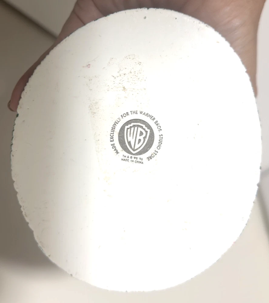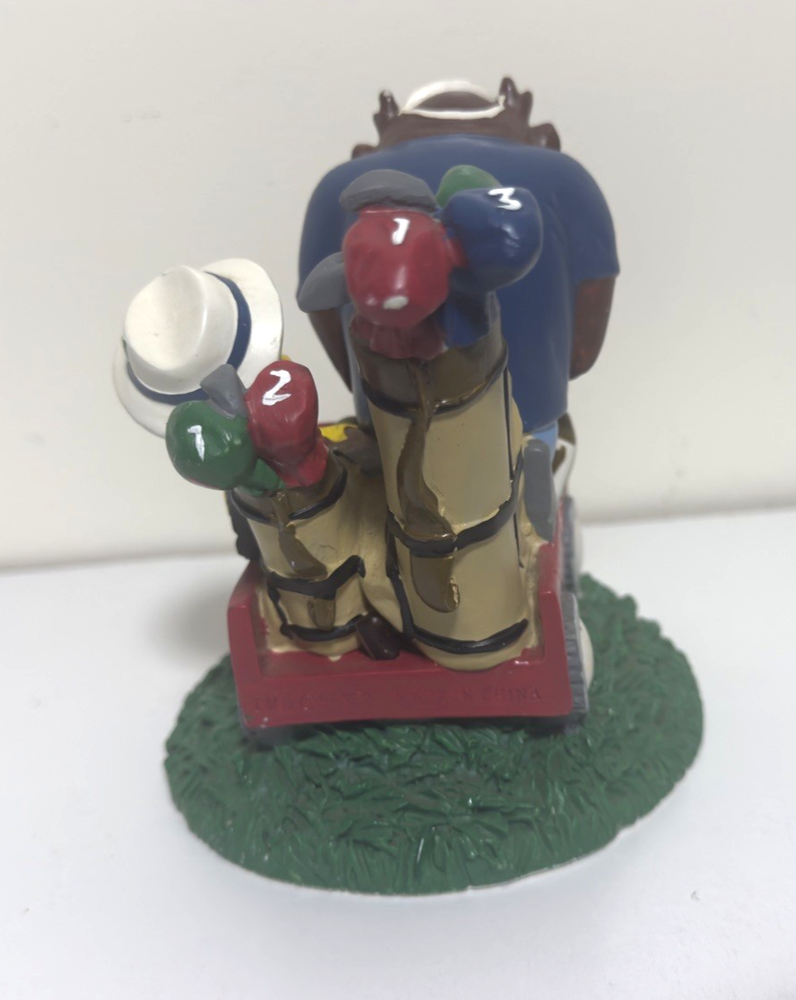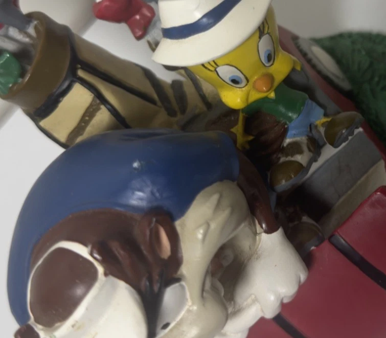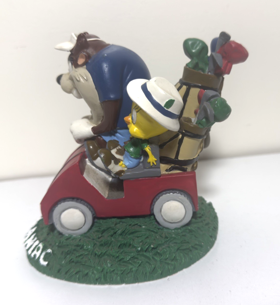 The Looney Tunes Taz Tweety Vintage 1996 Golf Maniac Figurine Statue is a nostalgic collectible featuring characters from the Warner Bros. franchise. This resin statue showcases the iconic Tasmanian Devil and Tweety in an interactive golfing scene, adding a touch of playfulness to any space. Manufactured in 1996 in China, this unique piece is a must-have for fans of classic Looney Tunes. Small paint chip shown in photo.