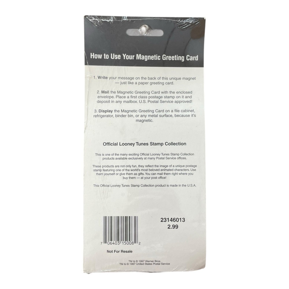 Year Manufactured:1997Color:MulticolorCountry of Origin:United StatesType:USPS Stamp Card CollectionLanguage:EnglishDecade:1997sBrand:Looney TunesFranchise:Warner BrotherCharacter:SylvesterSigned:NoBundle Description:Vintage sealed never has been openedMaterial:Paper