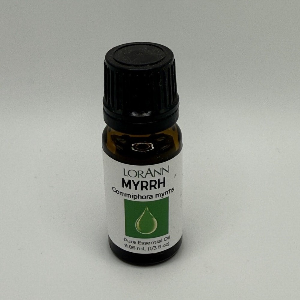 LorAnn Myrrh 100% Pure Essential Oil 1/3oz Bottle Description: All-natural, 100% pure botanical oil obtained exclusively through steam distillation Ideal for aromatherapy, candle making, soap making and many other uses; blends well with patchouli, lemon and lavender Warm, smoky and bitter aroma; highly concentrated - use sparingly Steam distilled without solvents or extractants; batch coded to ensure quality and traceability Expiration Date: 02/25