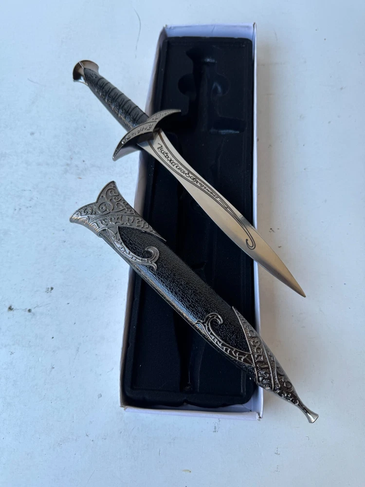 Lord of The Ring Medieval Hobbit Sting Sword Replica with Pointed Hard Sheath Description Lord of The Ring Medieval Hobbit Sting Sword Replica with Pointed Hard Sheath. Product Detail • Theme : Lord of The Ring • Blade Material : Stainless-Steel • Blade Color : Silver • Type : Sword Please message me if you have any questions.