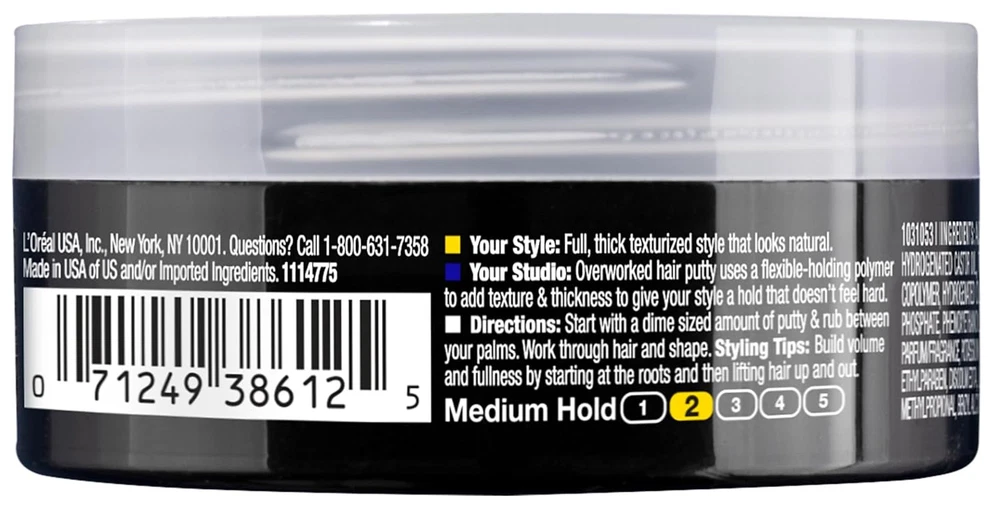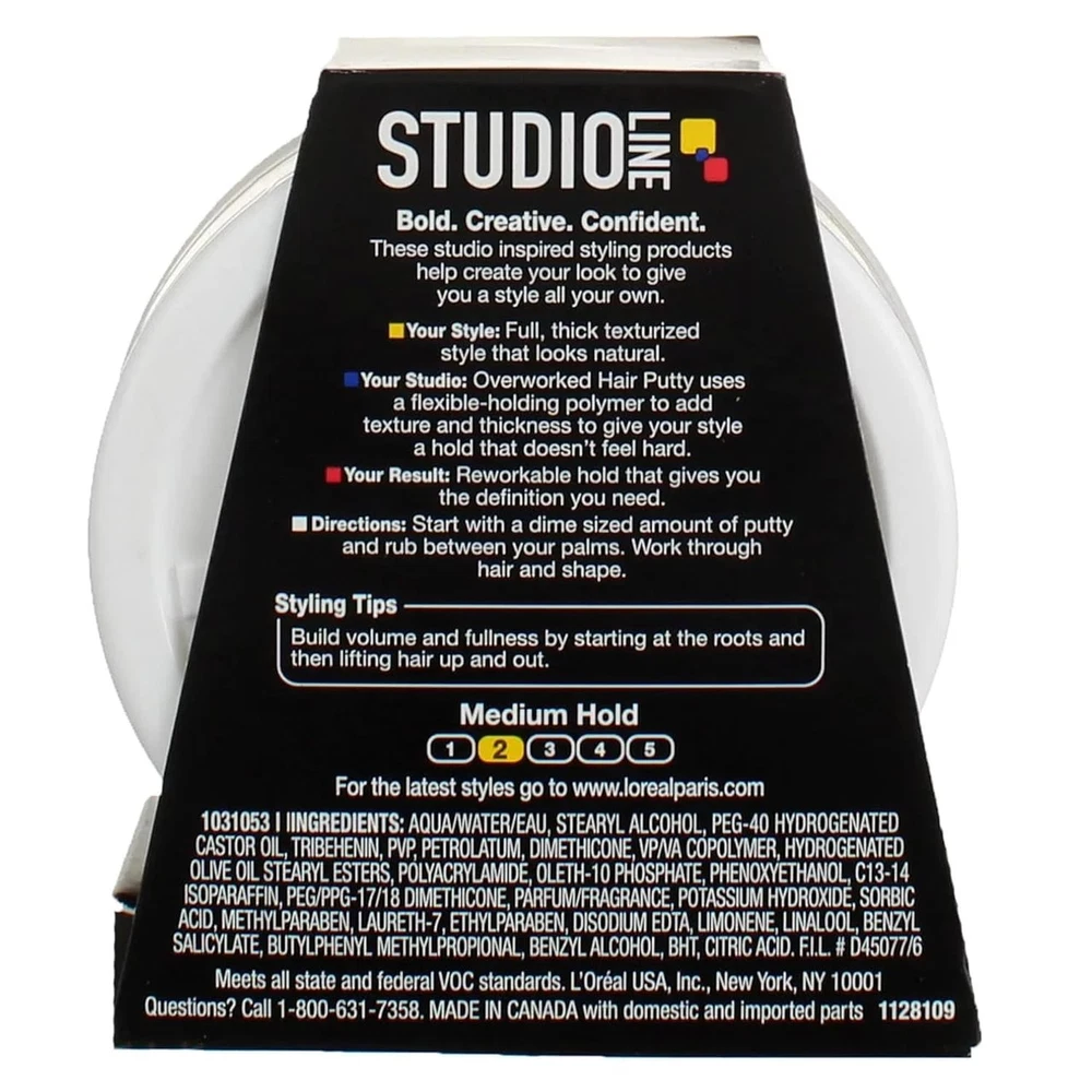 Product Description L'oreal Paris Studio Line Overworked Hair Gel Putty Texture 1.7 Oz (6 Pack) L'Oreal Paris Studio Line Clean Texture Reworkable Hold Hair Styling Paste, Spike it, piece it, smooth it and style it with L'Oreal Paris Studio Line Overworked Hair Putty. The L'Oreal Paris Studio Line collection makes it easy to get runway-ready looks with touchable, reworkable holds. L'Oreal Paris Studio Line Hair Putty is a special unisex hair paste that adds full, thick and texturized style. It works easily into wet or dry hair for effortless application. The thick paste is especially ideal for shorter hairstyles. Clean Look- The L'Oreal Paris Studio Like Overworked Hair Putty gives a clean, natural texture to your hairstyle Texturizing Style- The Overworked Hair Putty uses a flexible-holding polymer to add texture and thickness to give your style a hold that doesn't feel hard Natural Looking- L'Oreal Paris Studio Line Overworked Hair Putty gives you a full, thick texturized style that looks natural Reworkable Hold- The Studio Line Overworked Hair Putty adds a reworkable hold to your style that gives you the definition you need Perfect for Styling- The Overworked Hair Putty is perfect for a reworkable hold for short hairstyles and men's hairstyles Ingredients Water (Aqua) , Stearyl Alcohol , Tribehenin , PEG 40 Hydrogenated Castor Oil , PVP , Petrolatum , Dimethicone , VP/VA Copolymer , Hydrogenated Stearyl Olive Esters , Polyacrylamide , Polyethylene Glycol , Oleth 10 Phosphate , Phenoxyethanol , C13 14 Isoparaffin , PEG/PPG 17/18 Dimethicone , Fragrance , Sorbic Acid (A Preservative) , Methylparaben , Laureth 7 , Potassium Hydroxide , Propylparaben , Disodium EDTA , Limonene , Linalool , Benzyl Salicylate , Hydroxyisohexl 3 Cyclohexene Carboxaldehyde , Butylphenyl Methlyproprional