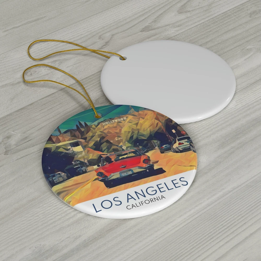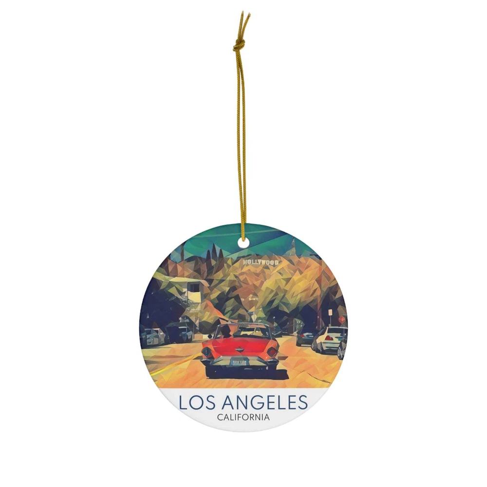 Los Angeles Ornament Christmas Gift Christmas Ornament Los Angeles Christmas Tree Ornament Newlywed Ornament Housewarming Gift Material: Ceramic Color: White Shapes: Circle, star, heart and oval Can be printed on both sides Imprint full-color artwork, photos, or logos Hole for hanging string and hanging string included Printed in the USA