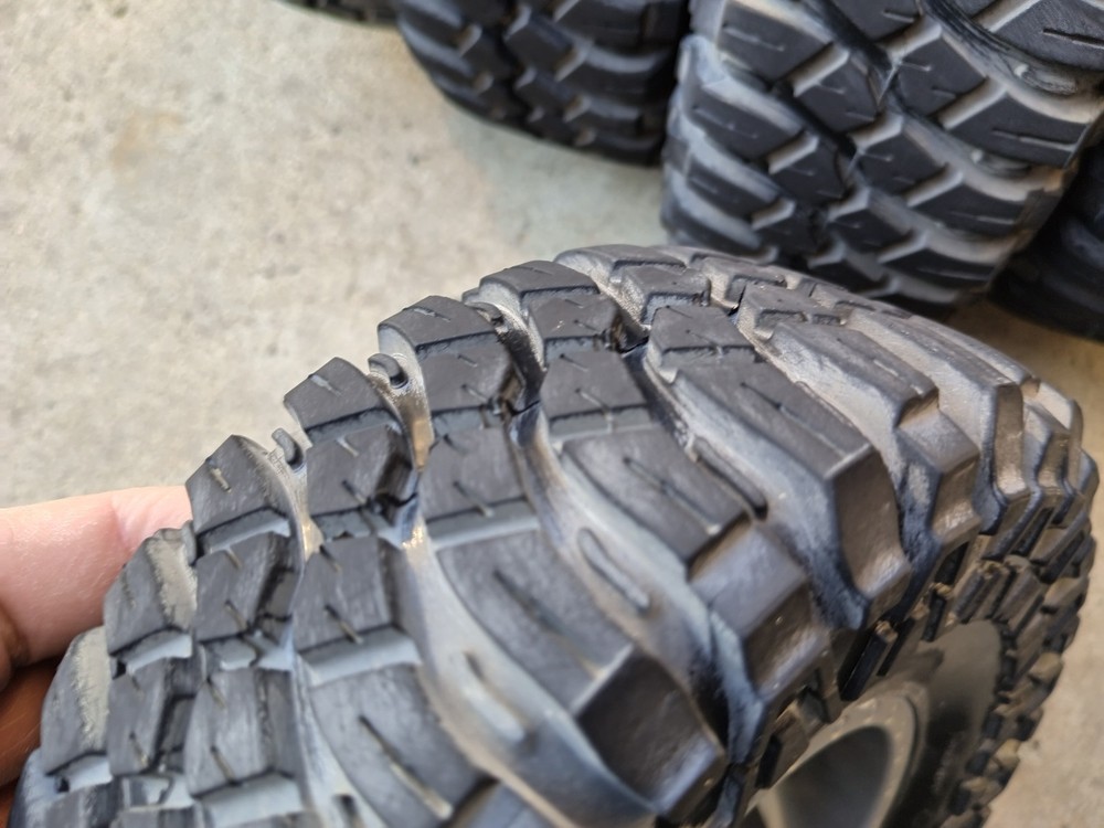 Losi Super Rock Rey 1/6 Maxxis Creepy Crawler LT Tires & Wheels Red Low Use QTY5 Used tires and wheels all 4 plus spare tire. Only used few times on dirt. No rips or cuts. No weather cracking. All hexes are in great shape.Some scratches and scuffs on the red imitation bead lock ring.