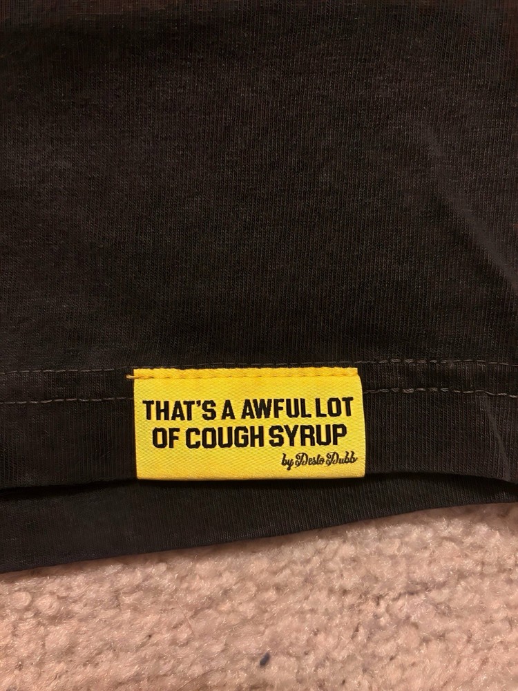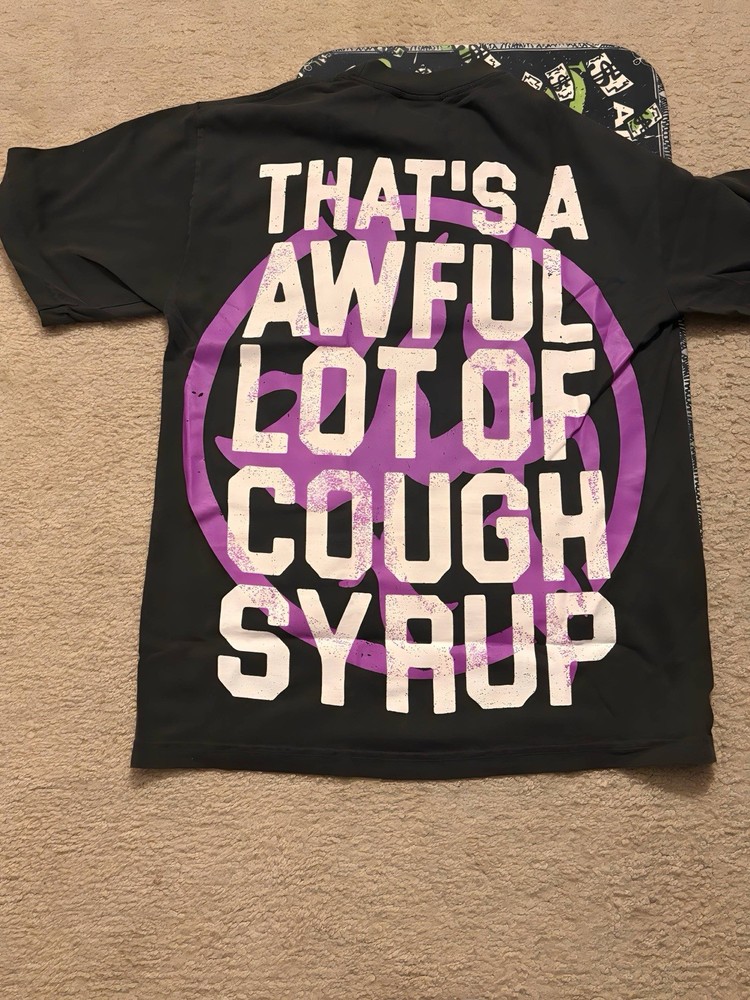 The Lost Hills x Awful Lot Of Cough Syrup black graphic T-shirt is a stylish and edgy piece of men's clothing featuring a graphic print design with a hip hop theme. Made from 100% cotton with a crew neck and short sleeves, this shirt is perfect for summer, fall, and spring seasons. The black and white color scheme with purple accents adds a unique and bold touch to the overall look, making it a standout piece in any wardrobe. Showcasing the collaboration between Lost Hills and Awful Lot Of Cough Syrup, this T-shirt is a must-have for fans of urban fashion.