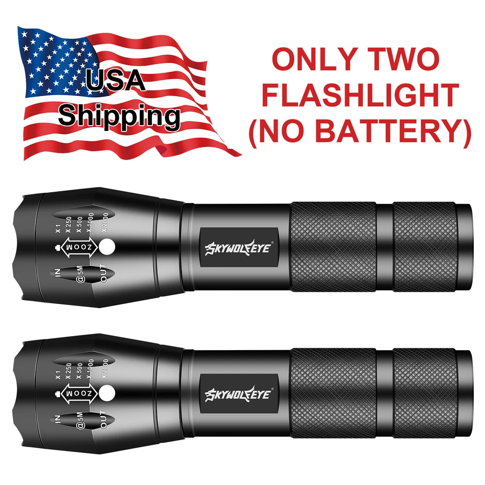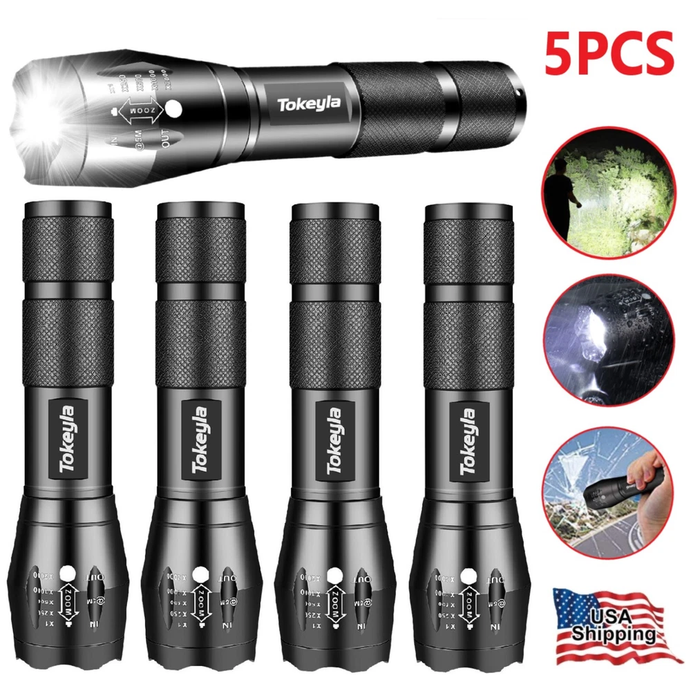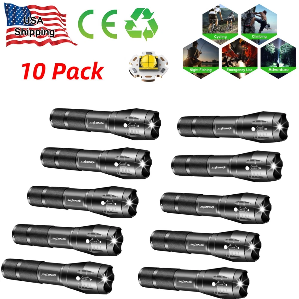 Lot 1-10 Pack Super Bright LED Flashlight Small Flashlights Zoom Working Torch ‼️‼️【Note】 Batteries not included, please feel free to contact us if any need. Features: 1. [SUPER BRIGHT WITH 5 MODES] : The super bright flashlight LED uses advanced LED beads, emits bright light up to 2000 lumens and reaches nearly 656ft, it can easily light up an entire room! Adjustable/zoomable focus with 5 modes: High- Medium- Low- Strobe- SOS (for Emergency). 2. [WATERPROOF]: The small LED flashlight can be used in any weather. The aluminum alloy body has no rust issue. The flashlight high lumens super bright waterproof can be daily used, like troubleshooting, biking, hiking, camping, walking dog, or for emergency, survival, etc... 3. [ADJUSTABLE FOCUS]: Our handheld flashlights tactical torch utilize the latest durable LED chip, provides super bright light beam. Easy-controlled head-pulling zoom and easy mode-switch by light taps of button. Adjustable focus for use in different situations it ideal for use around the house 4. [PREMIUM QUALITY & LONG-LASTING]: Our flashlight super bright is made of high quality aluminum alloy, this super bright LED Flashlight is solid and sturdy, the edge designed is sharp and strong, can easily break the windows in case there's a car accident. Specification: Type of flashlight: Super Bright LED Flashlight Small LED Type: LED Output Power (max): 10W Power by: 1x 3.7v Li-ion Rechargeable Battery (Not included) Size: 4.80 x 1.06 x0.95 inches Material: Aluminum Weight: 2.5 ounce Function: Zoomable Light Mode: High/Medium/Low/Strobe/SOS Warm Tips: 1. Before use, please remove the the plastic packaging film of the battery. 2. Please take out the battery if you won't use for a long time to avoid battery leakage. 3. Please do not submerged handheld super bright zoomable LED flashlight underwater as it doesn't 100% waterproof. 4. Please select a lower setting when the LED flashlight super bright torch zoomable is hot as it is typical for high powered led flashlight and will not cause damage to the handheld flashlight. 5. Don't directly illuminate the eyes. Note:Please find us in first time when you find the parcel Broken/Scratch/Function Error/Miss Parts/Unwork/has not arrived etc, we always have more details and solutions, even duty for your order. Package includes: Package 1: 10x Super Bright LED Flashlight Small (not included battery) Package 2: 5x Super Bright LED Flashlight Small (not included battery) Package 3: 3x Super Bright LED Flashlight Small (not included battery) Package 4: 2x Super Bright LED Flashlight Small (not included battery) Package 5: 1x Super Bright LED Flashlight Small (not included battery) On Dec 11, 2024 at 17:07:21 PST, seller added the following information: