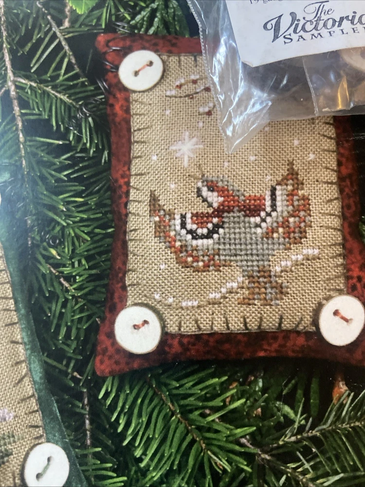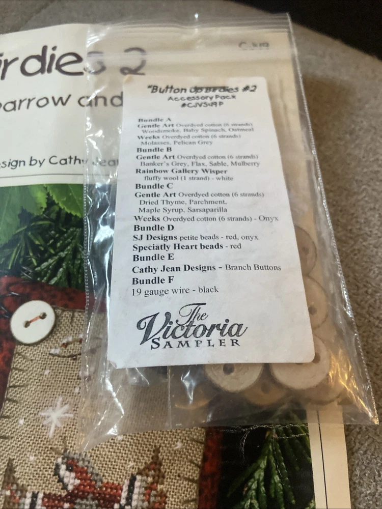 Two kits that are sealed with the pattern and the accessories for the button up birdies by Kathy Jean for the Victoria sampler. You will receive pattern number two and three with the accessory packs attached but I do believe one of this accessory packs might be missing something I’m not 100% sure unless all of the thread is in the first packplease see the photos of the two accessory packs and decide for yourself. These kids are sold as is in new condition and accessory packs are stapled to the patterns, but I’m not sure why there’s not thread in one of them.
