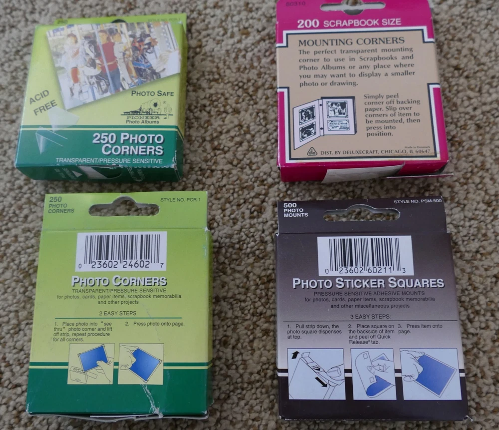 Lot of 3 boxes of photo corners and 1 of sticker squares. Photo Safe Acid & PVC Free The two green boxes - 1 is unopened, 1 I am not sure, but it's mostly there. The pink box has been opened but minimally used. The brown box is unopened. It has 500 sticker squares.