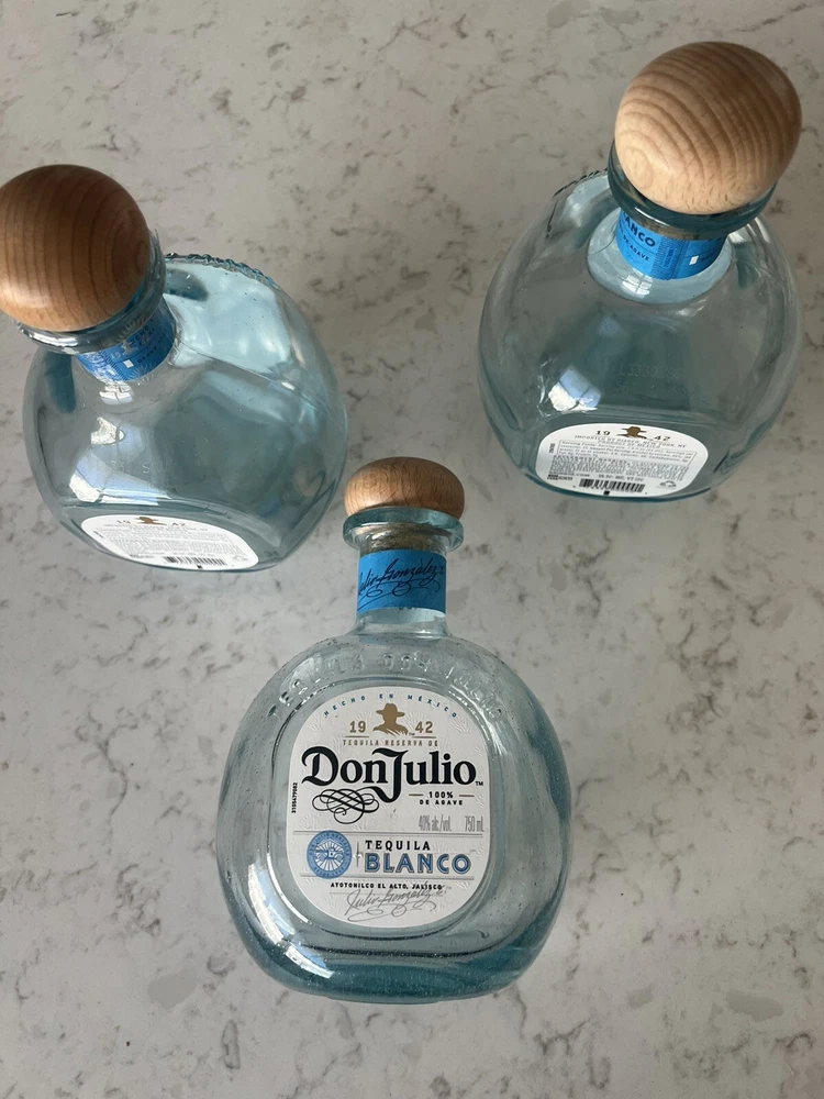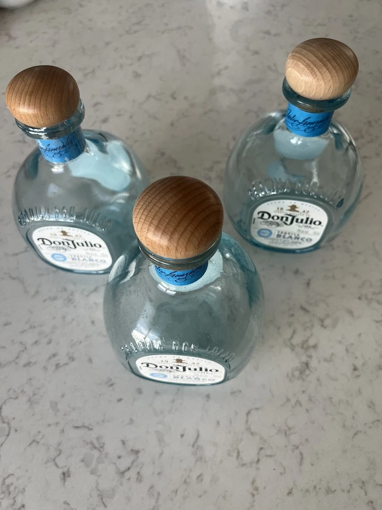 This lot includes three empty glass bottles of Don Julio Blanco Tequila, each with a volume of 750ml and a white color. The bottles are made in Mexico and have not been modified. They come with corks and are suitable for collectors or those who enjoy drinking liquor. Please note that there is a California Prop 65 Warning issued by the state's Department of Health Services. The warning can be found at www.P65Warnings.ca.gov. If you have any questions or concerns, please feel free to contact us.