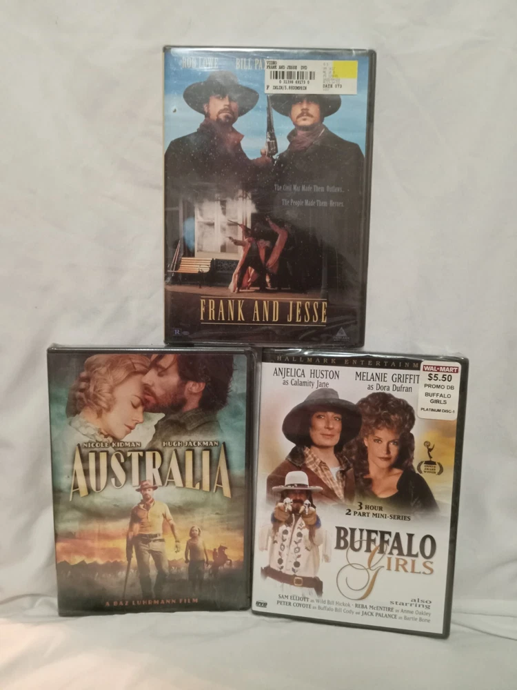 Enjoy the captivating storyline of three modern western movies in this DVD lot. Featuring Nicole Kidman and Hugh Jackman, this collection includes "Australia," "Frank and Jesse," and "Buffalo Gals." Rated PG, these movies are perfect for a movie night with the family. The standard edition DVD format comes in a jewel case and has a region code of DVD: 1 (US, Canada...). The language is English and the studio behind these films is 20th Century Fox. These movies are a must-have for any movie lover and is a great addition to your collection.