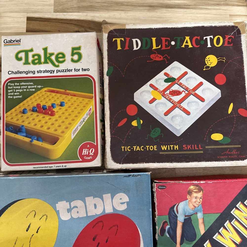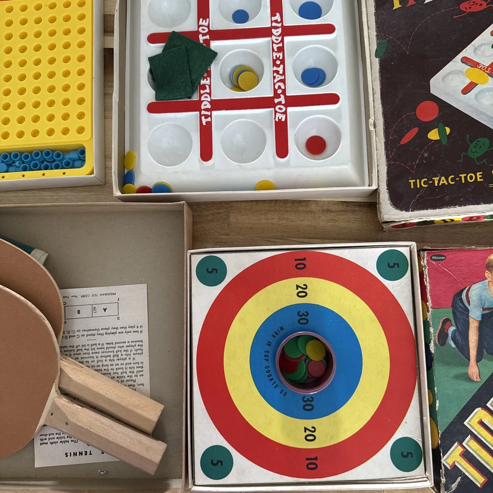The product is a lot of 4 vintage board games including Table Tennis, Toddlers Toe Take, 5 Tiddly Winks, and other games. These classic games are perfect for young children and are sure to provide hours of entertainment. The games are designed to be simple and engaging, making them ideal for young children who are just starting to learn how to play. This lot of games is a great way to introduce a new generation to the fun and joy of traditional board games.