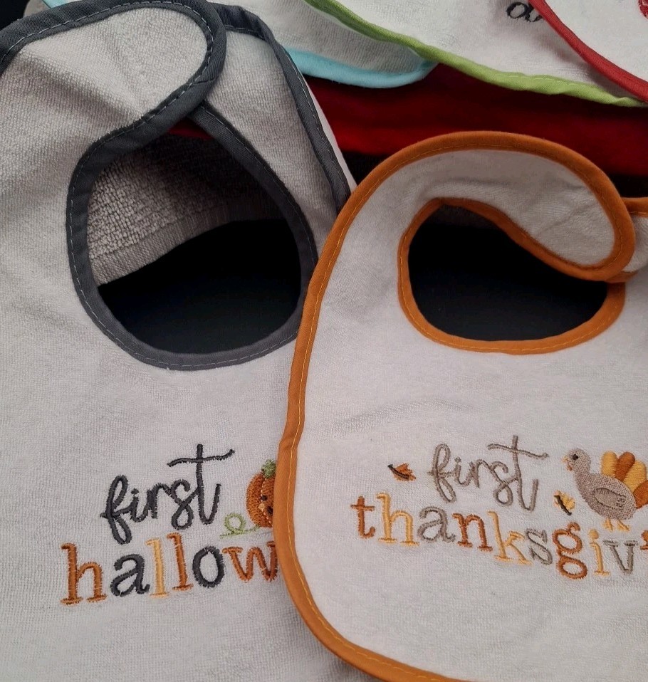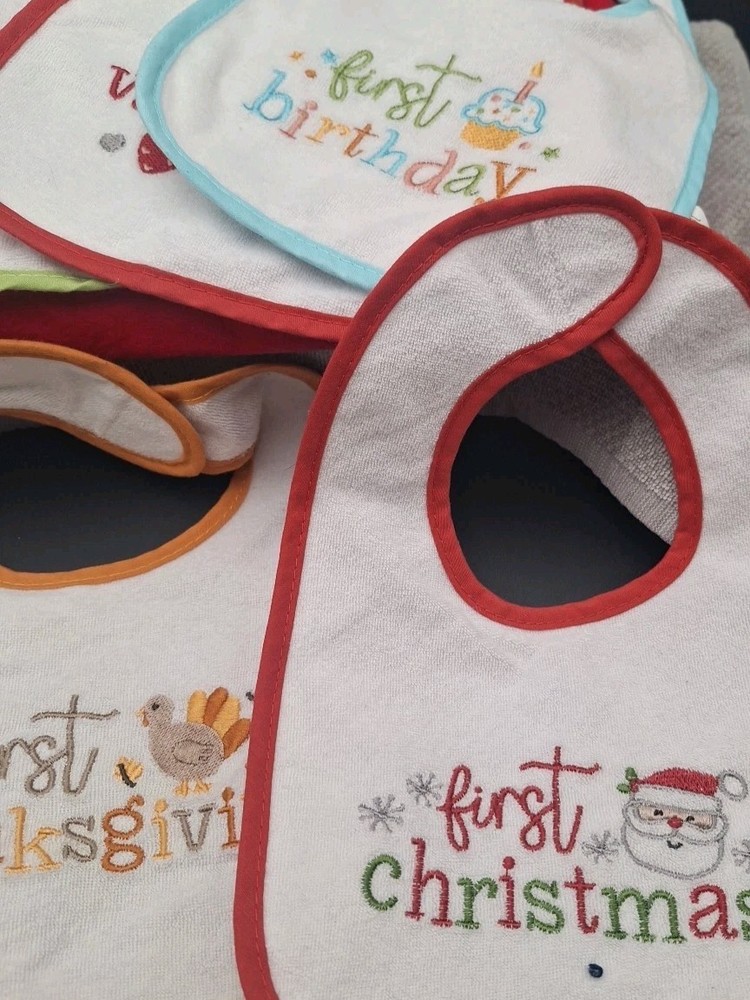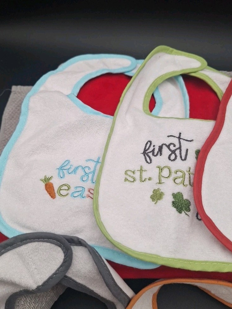 This lot of 7 cute baby bibs features a holiday and celebration-themed design, perfect for adding some festive charm to mealtime. Made of soft cotton material, these bibs have a Velcro closure for easy on and off. The bibs showcase various holiday characters and motifs, making them a fun and functional addition to your baby's feeding routine. Ideal for capturing drool and spills during mealtime, these bibs are sure to bring joy to both parents and little ones during special occasions.