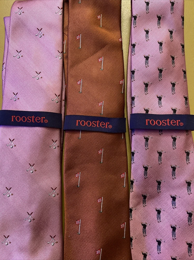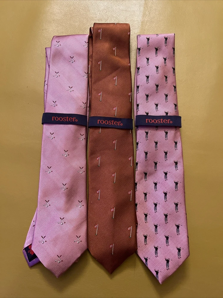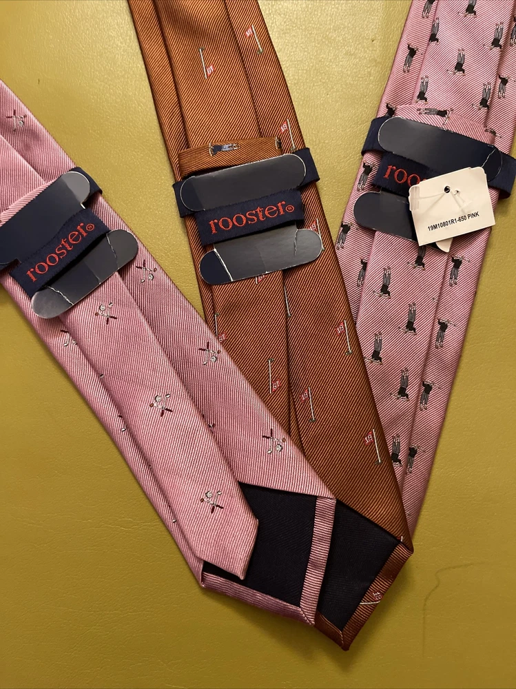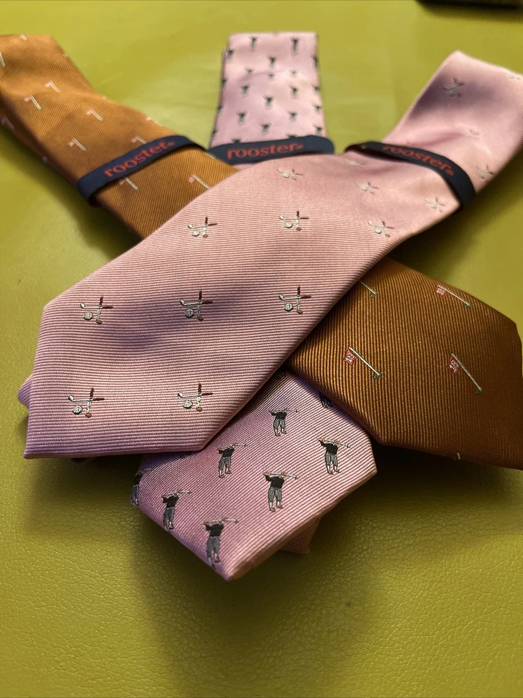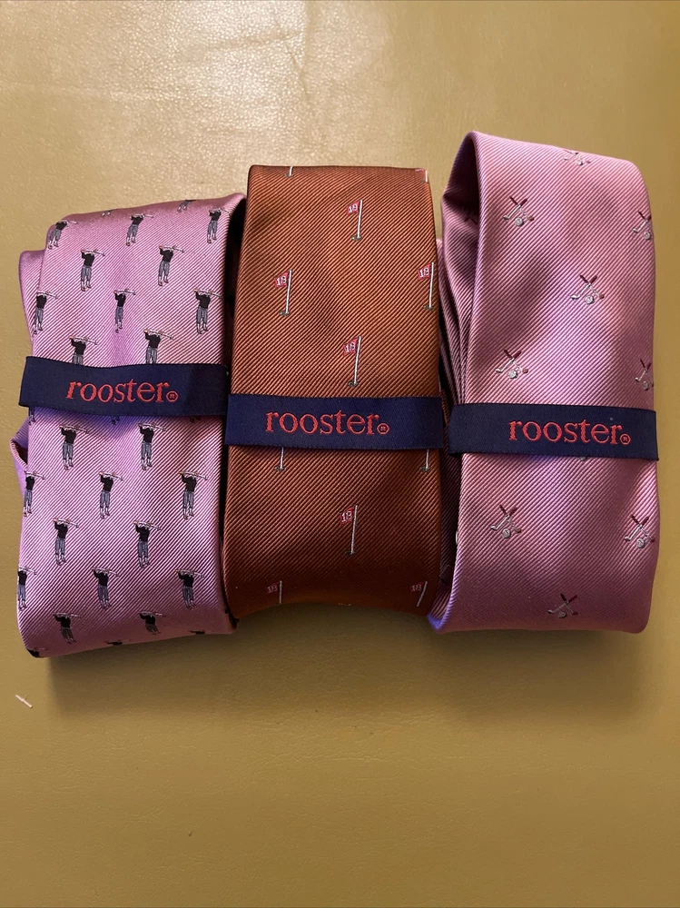 Lot 3 New Golf Ties by Rooster You get 2 pink ties and 1 rust colored tie The ties are made of 75% Silk 25% Polyester They make a great gift Add some style to your wardrobe with these Rooster golf-themed neckties. Made from a luxurious silk blend fabric, these ties come in a set of three with a multicolor pattern and feature golf balls, sticks, and the iconic 18th hole. Perfect for any golf enthusiast or for adding a touch of personality to your formal attire. These ties are of classic length and width, and are attached by tying. Buy with total confidence from a seasoned Ebayer who ships fast Happy Shopping!