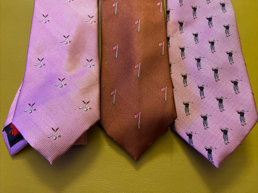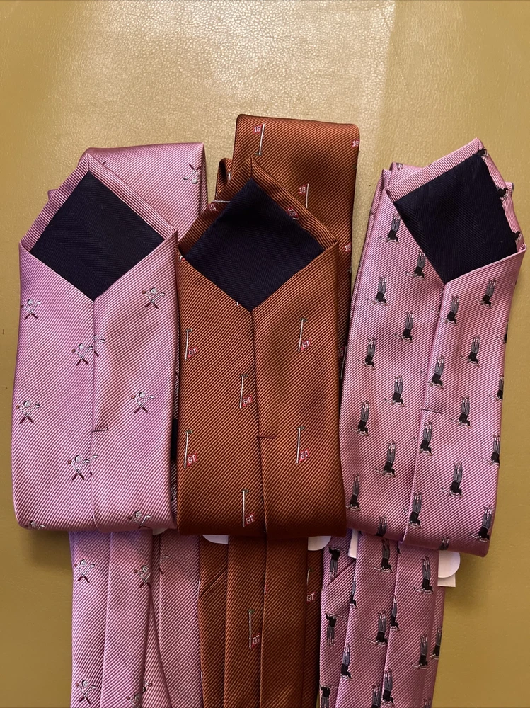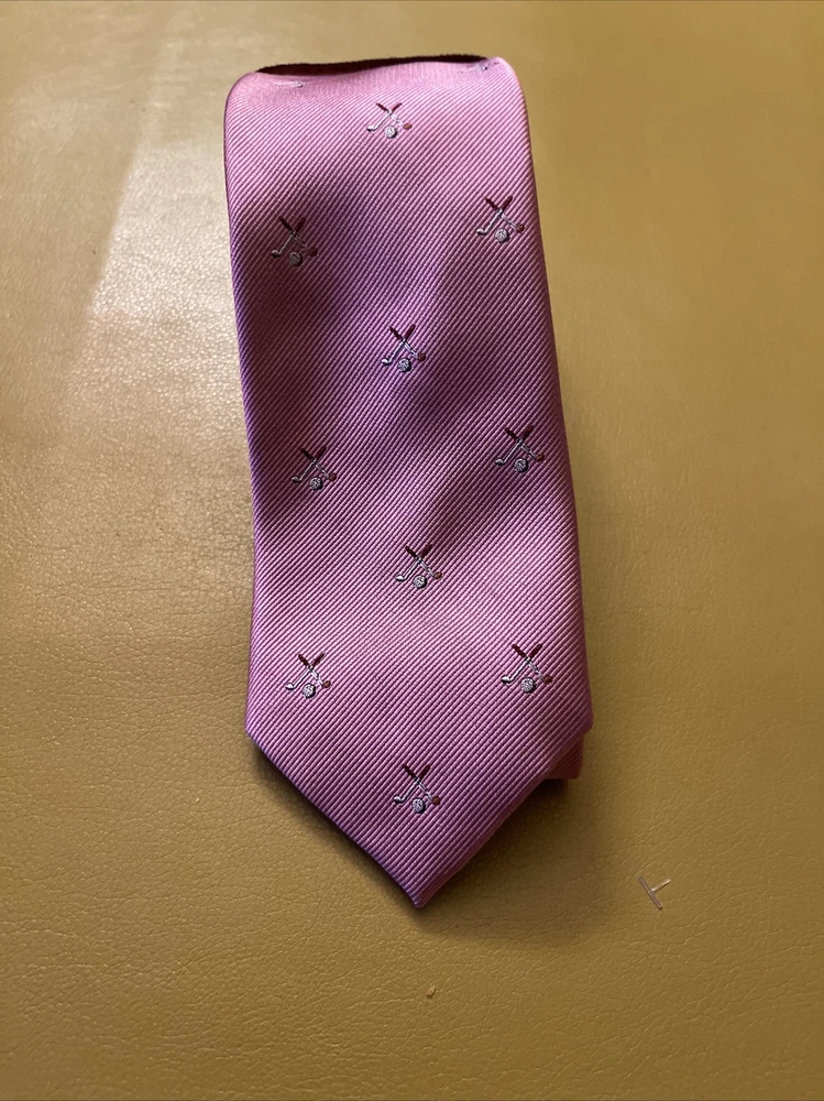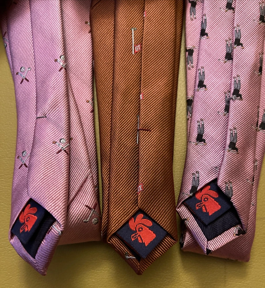 Lot 3 New Golf Ties by Rooster You get 2 pink ties and 1 rust colored tie The ties are made of 75% Silk 25% Polyester They make a great gift Add some style to your wardrobe with these Rooster golf-themed neckties. Made from a luxurious silk blend fabric, these ties come in a set of three with a multicolor pattern and feature golf balls, sticks, and the iconic 18th hole. Perfect for any golf enthusiast or for adding a touch of personality to your formal attire. These ties are of classic length and width, and are attached by tying. Buy with total confidence from a seasoned Ebayer who ships fast Happy Shopping!