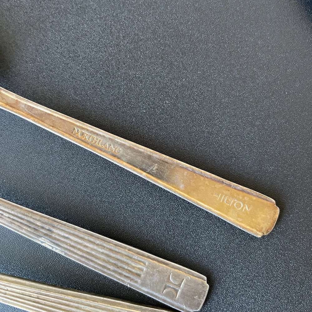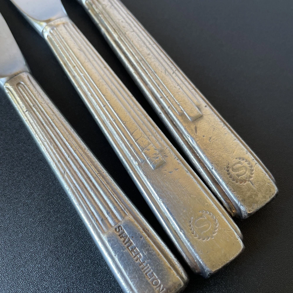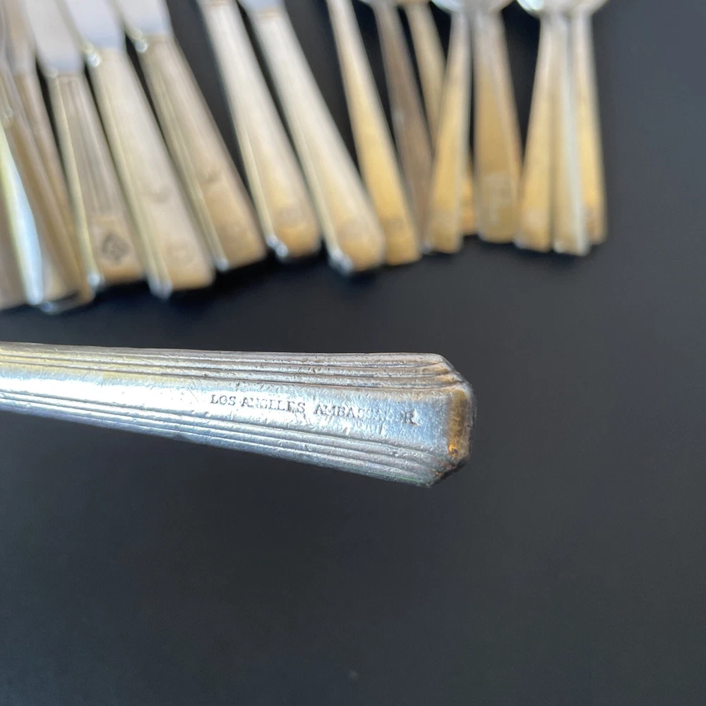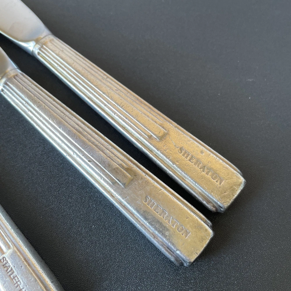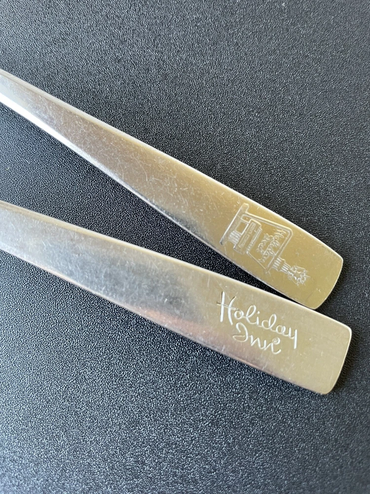 Lot of vintage hotel and restaurant flatware. Set includes: -Two spoons and three knives from Holiday Inn; most are smaller size -Five Sheraton teaspoons, marked Oneida -One Sheraton dinner fork, marked Oneida -Four Sheraton dinner knives in two different styles -Three Hilton teaspoons, one a slightly different style -One Statler Hilton knife, smaller size -One knife from the Ambassador Hotel in Los Angeles, smaller size -One Denny's teaspoon -One silver plate Hilton cocktail fork -One cocktail fork from Mike Lyman Grills -One cocktail fork with "DI" on the handle; I cannot identify where this is from -One dinner fork from YWCA -One dinner fork from The Manhattan -One demitasse spoon from Jurys Inns -One demitasse spoon marked Universitets Sentret Oslo and Norway on the back -One demitasse spoon from The Beverly Hilton All have wear, including dulling, some scratching, and tarnish. Some forks have bent tines. I have not polished any of the silverware. Some of the hollow knife handles have a lot of dings and dents. Please see all photos.