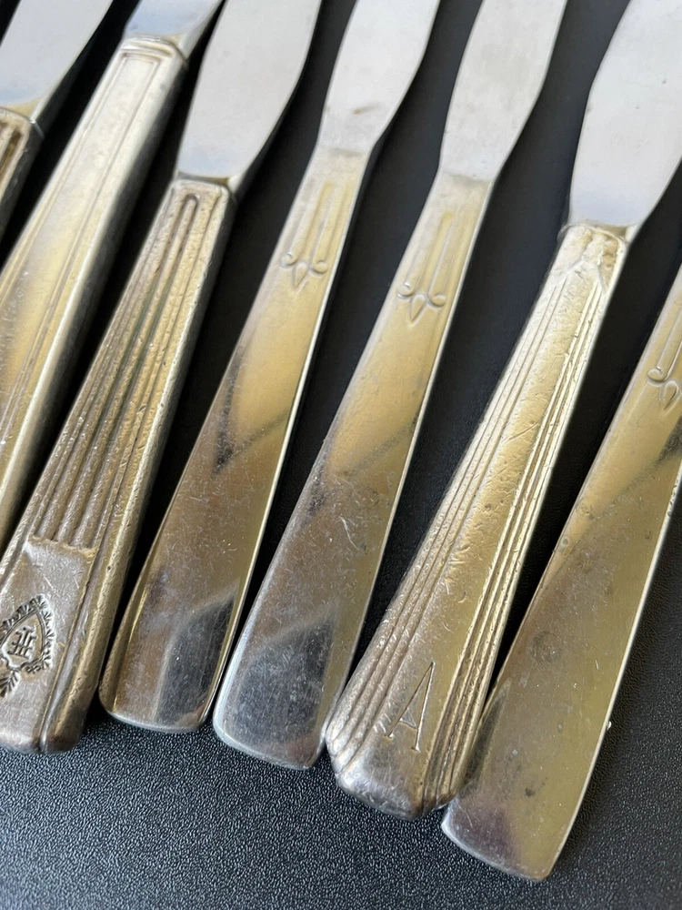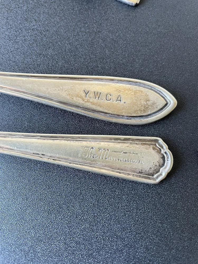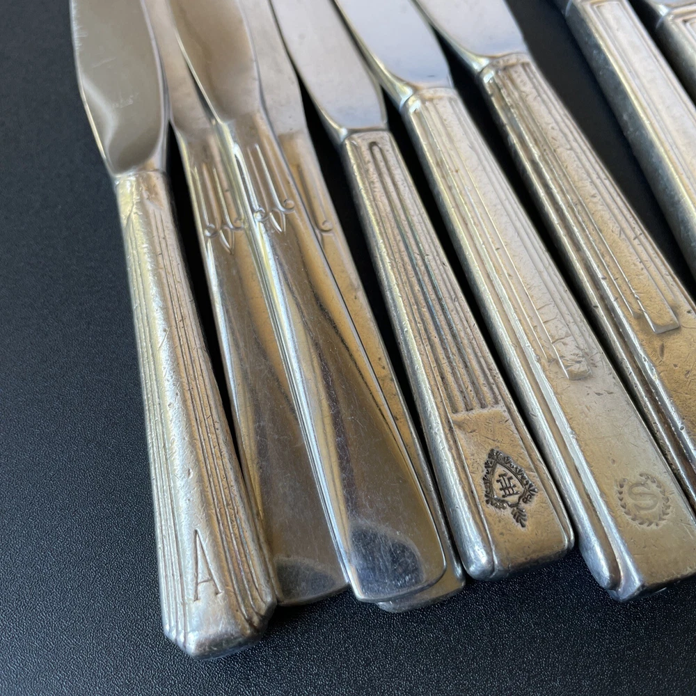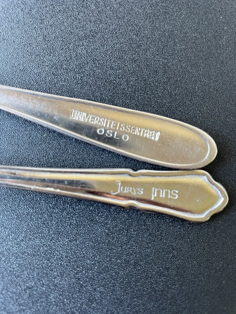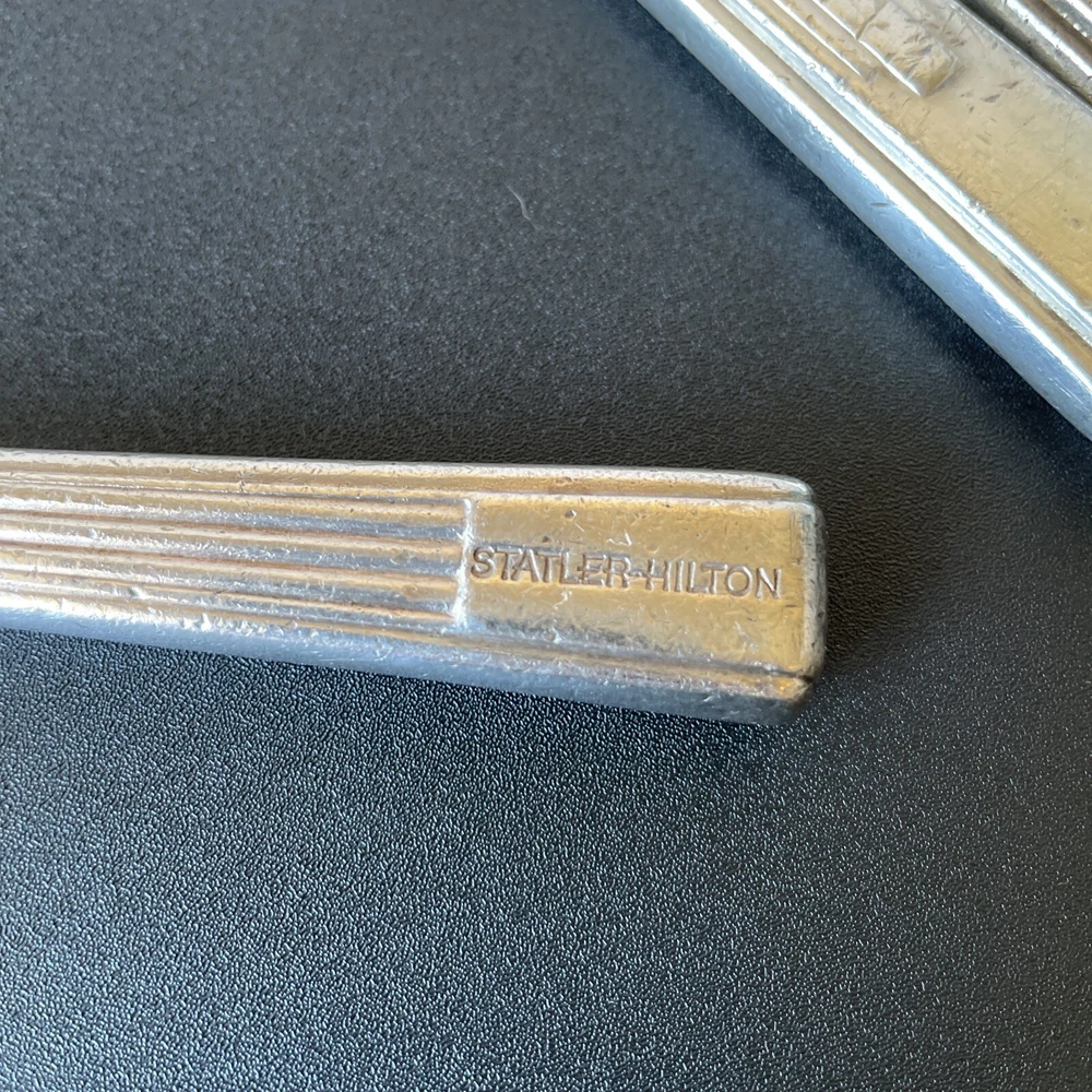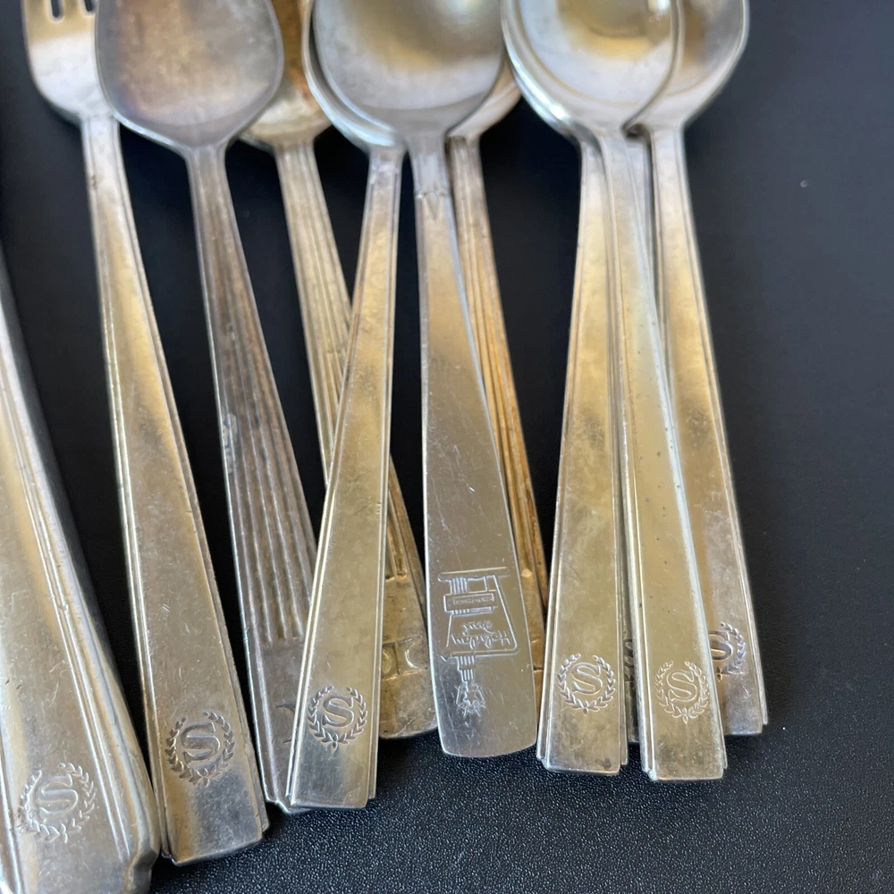 Lot of vintage hotel and restaurant flatware. Set includes: -Two spoons and three knives from Holiday Inn; most are smaller size -Five Sheraton teaspoons, marked Oneida -One Sheraton dinner fork, marked Oneida -Four Sheraton dinner knives in two different styles -Three Hilton teaspoons, one a slightly different style -One Statler Hilton knife, smaller size -One knife from the Ambassador Hotel in Los Angeles, smaller size -One Denny's teaspoon -One silver plate Hilton cocktail fork -One cocktail fork from Mike Lyman Grills -One cocktail fork with "DI" on the handle; I cannot identify where this is from -One dinner fork from YWCA -One dinner fork from The Manhattan -One demitasse spoon from Jurys Inns -One demitasse spoon marked Universitets Sentret Oslo and Norway on the back -One demitasse spoon from The Beverly Hilton All have wear, including dulling, some scratching, and tarnish. Some forks have bent tines. I have not polished any of the silverware. Some of the hollow knife handles have a lot of dings and dents. Please see all photos.