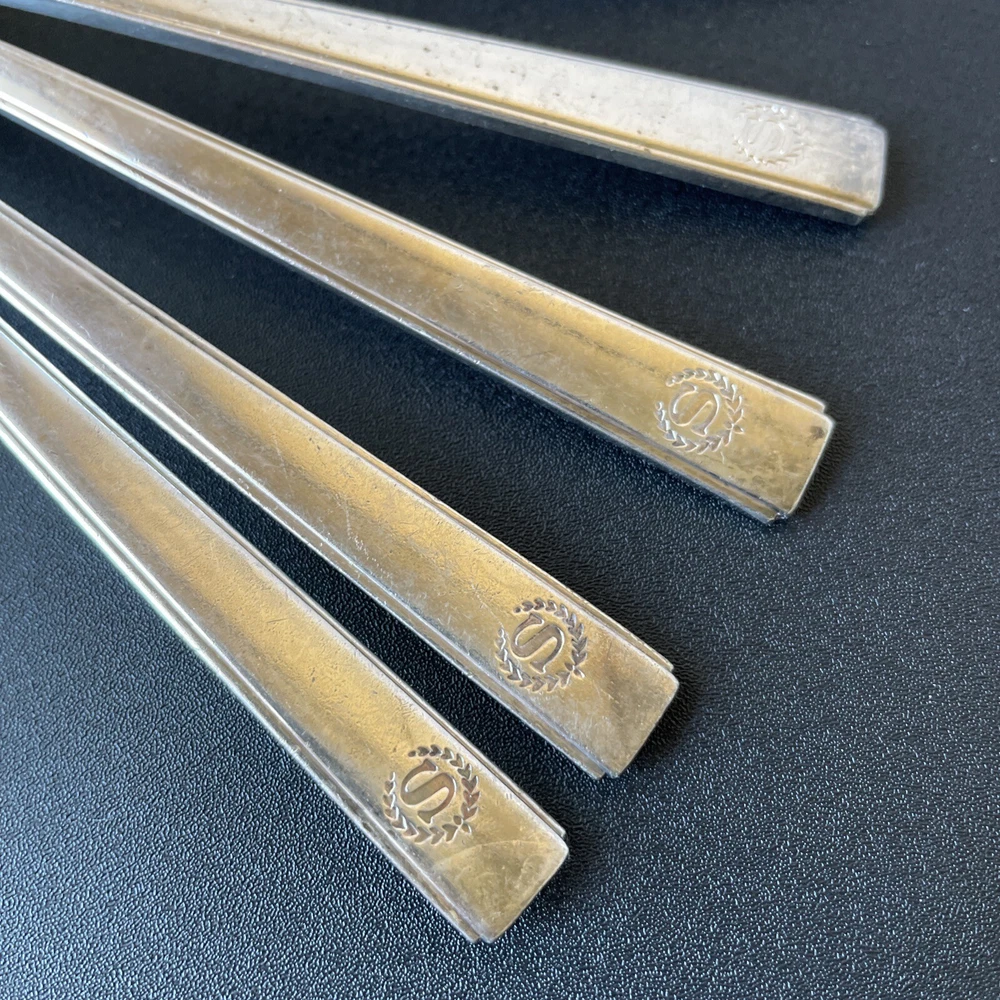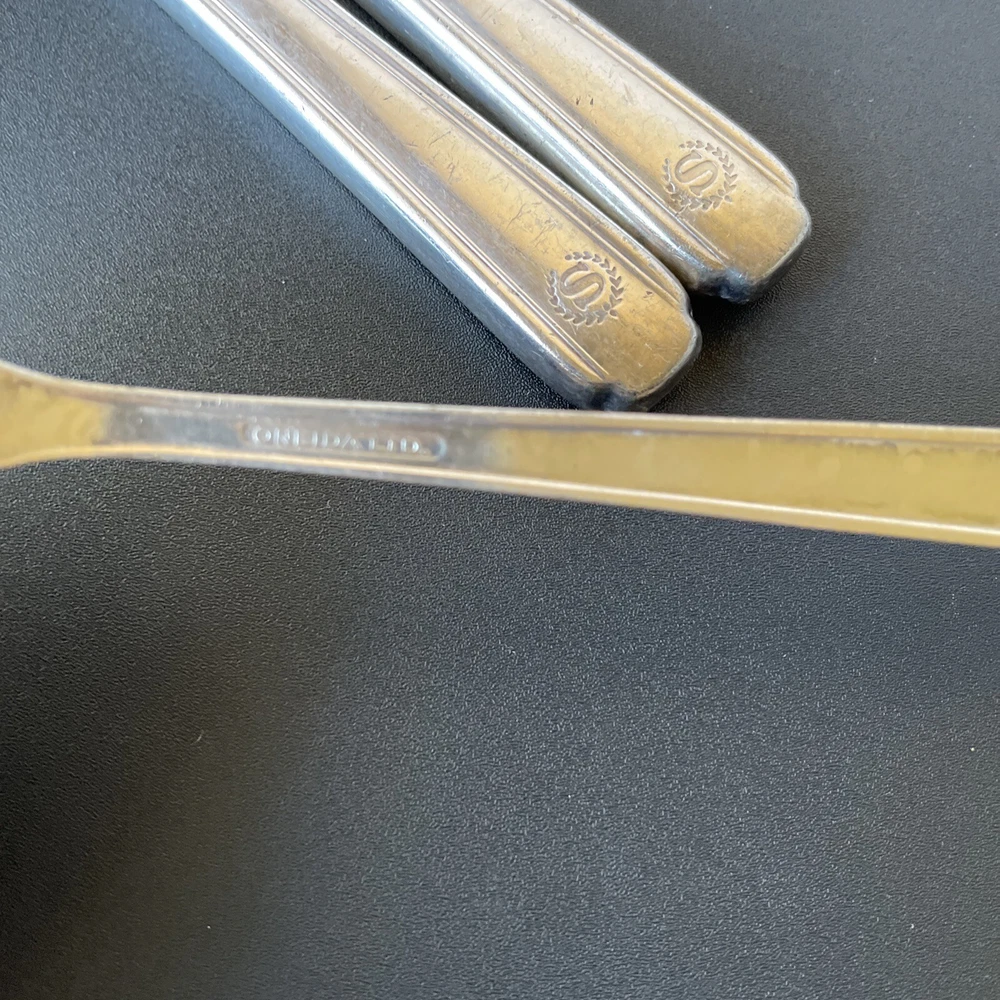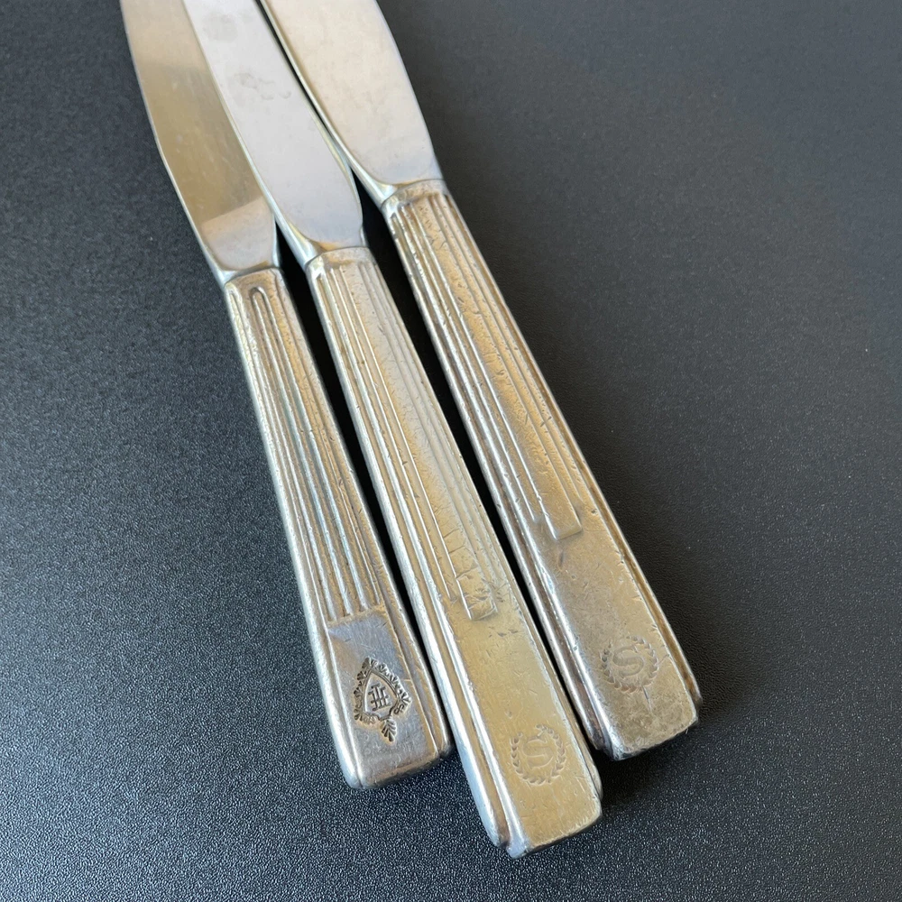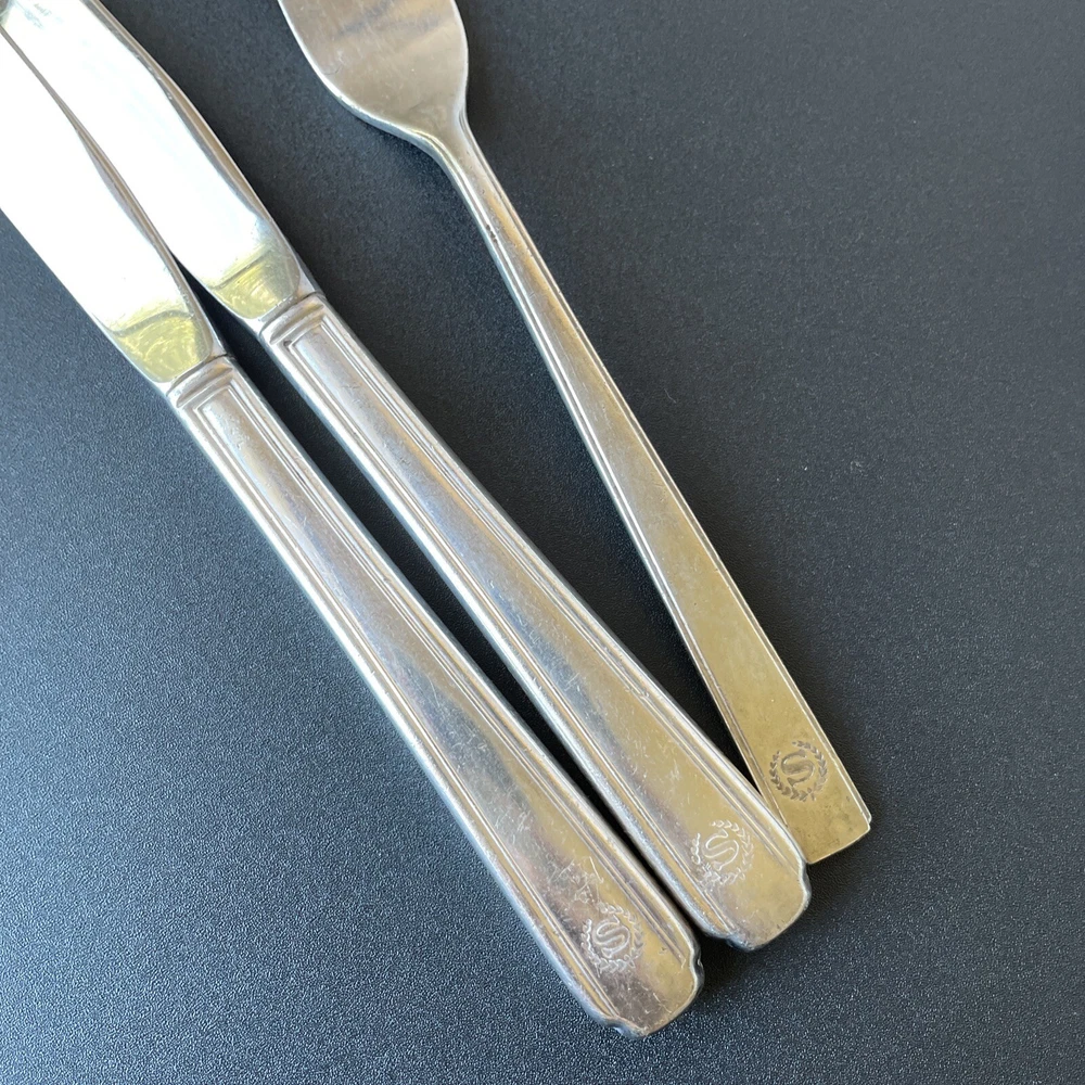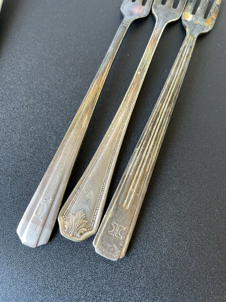 Lot of vintage hotel and restaurant flatware. Set includes: -Two spoons and three knives from Holiday Inn; most are smaller size -Five Sheraton teaspoons, marked Oneida -One Sheraton dinner fork, marked Oneida -Four Sheraton dinner knives in two different styles -Three Hilton teaspoons, one a slightly different style -One Statler Hilton knife, smaller size -One knife from the Ambassador Hotel in Los Angeles, smaller size -One Denny's teaspoon -One silver plate Hilton cocktail fork -One cocktail fork from Mike Lyman Grills -One cocktail fork with "DI" on the handle; I cannot identify where this is from -One dinner fork from YWCA -One dinner fork from The Manhattan -One demitasse spoon from Jurys Inns -One demitasse spoon marked Universitets Sentret Oslo and Norway on the back -One demitasse spoon from The Beverly Hilton All have wear, including dulling, some scratching, and tarnish. Some forks have bent tines. I have not polished any of the silverware. Some of the hollow knife handles have a lot of dings and dents. Please see all photos.