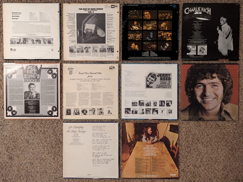 This listing is for the following 10 vinyl LP albums (12" records, 33 RPM): Buck Owens and His Buckaroos - Tall Dark Stranger (1969, ST-212) Buck Owens and His Buckaroos - Best of Buck Owens Vol. 2 (1968, ST 2897) Johnny Cash - Johnny Cash at San Quentin (1969, CS 9827) Charlie Rich - She Called Me Baby (1974, APL1-0686) Pee Wee King - Pee Wee King's Biggest Hits (1971, CAS-2460) Various Artists - Something Special (SL-6655) Jerry Reed - Hot A' Mighty! (1973, LSP-4838) Mac Davis - Mac Davis (1973, KC 32206) Joe Stampley - All These Things (1976, DOSD-2059) B.W. Stevenson - My Maria (1973, APL1-0088) Records are in fair to good condition with no warping and include jackets and inner sleeves. Some jackets have holes punched in the left side.
