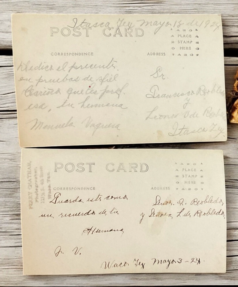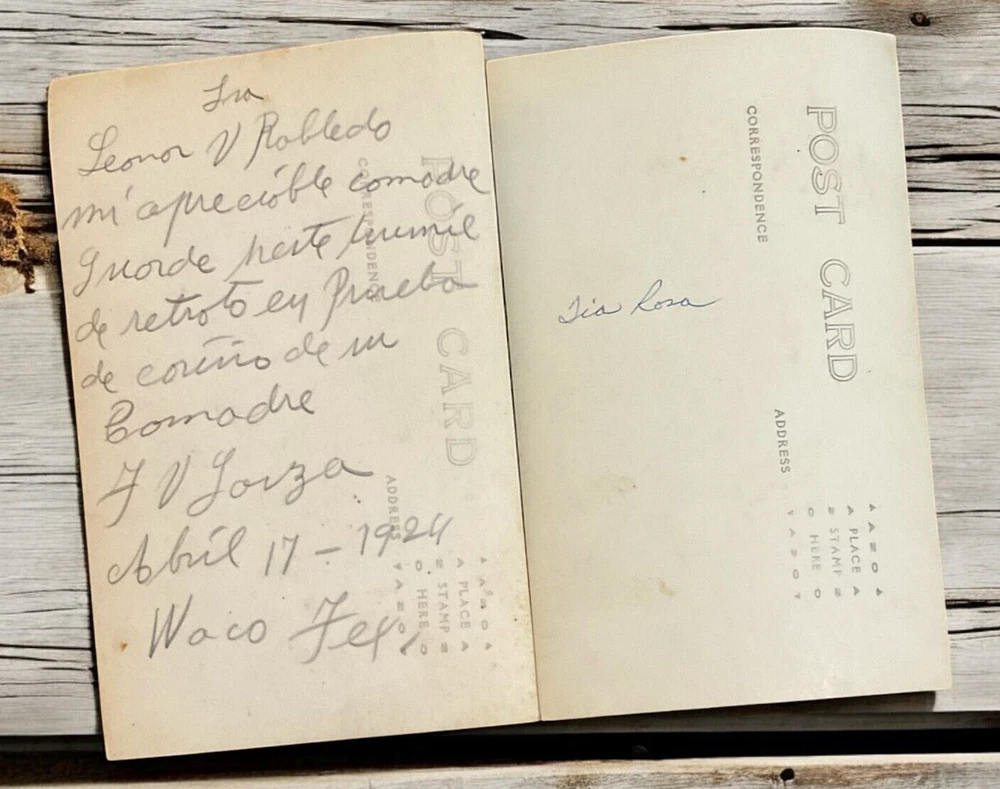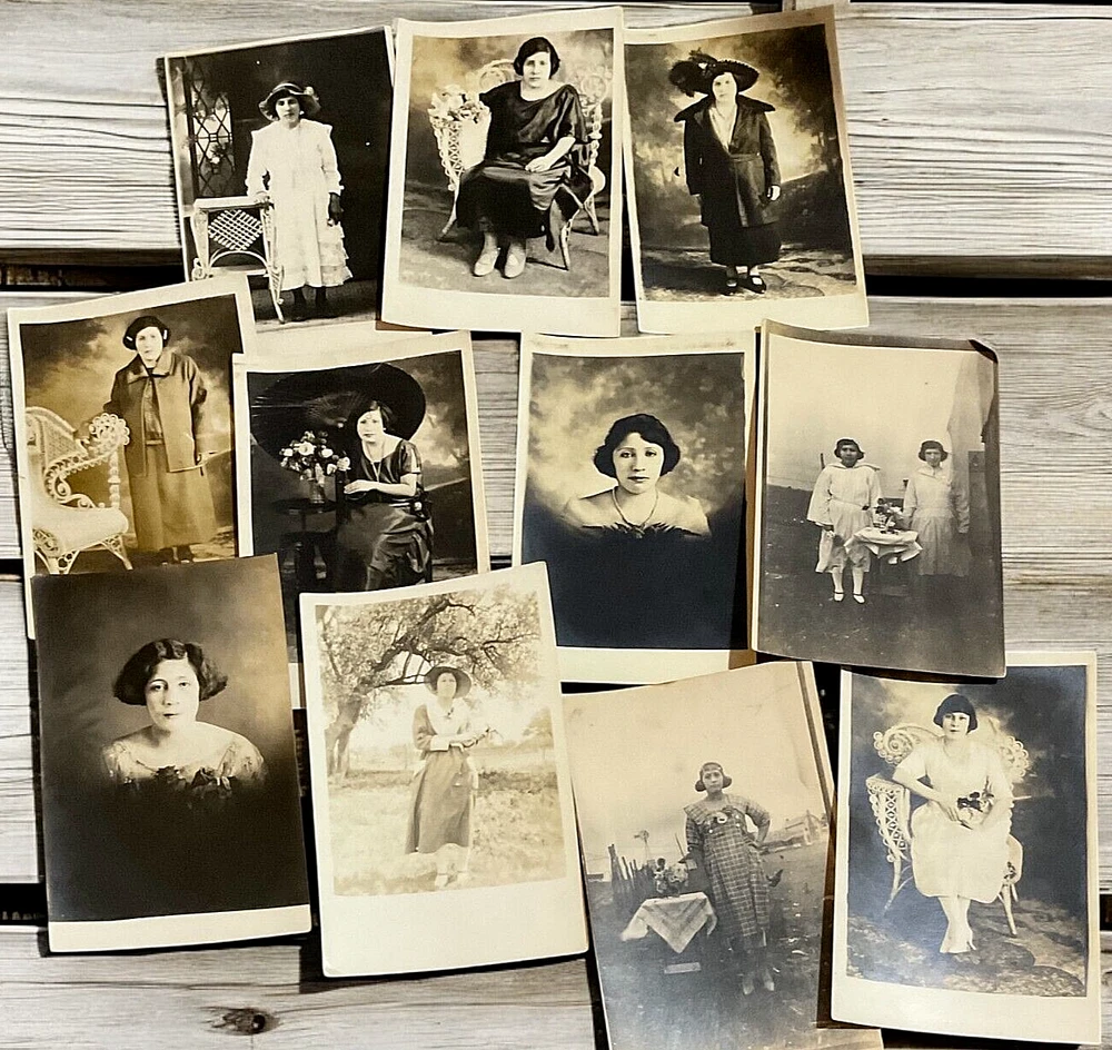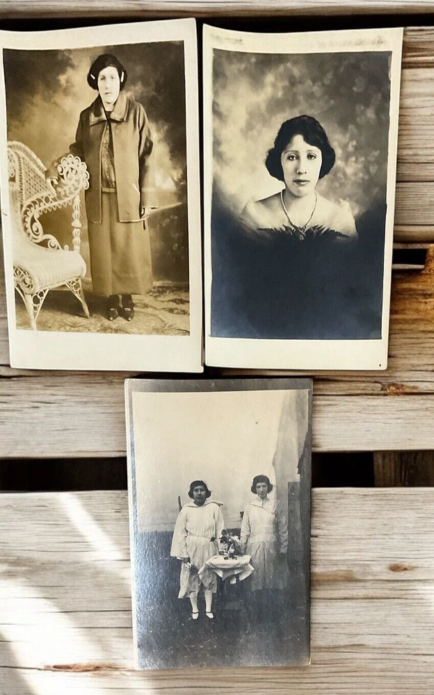 Lot of 11 RPPC's Real Photograph Post Cards of Hispanic Women & Girls dated 1920 - 1924 in Texas. Most photographs are black and white with a couple being sepia and are approximately 3-3/8" x 5-3/8". All cards have some degree of yellowing due age, slight bends/creasing, and stains/spanish writing on back. Photographs feature young and middle age Hispanic women posing with chairs/indoor and a couple are outdoor photo's.