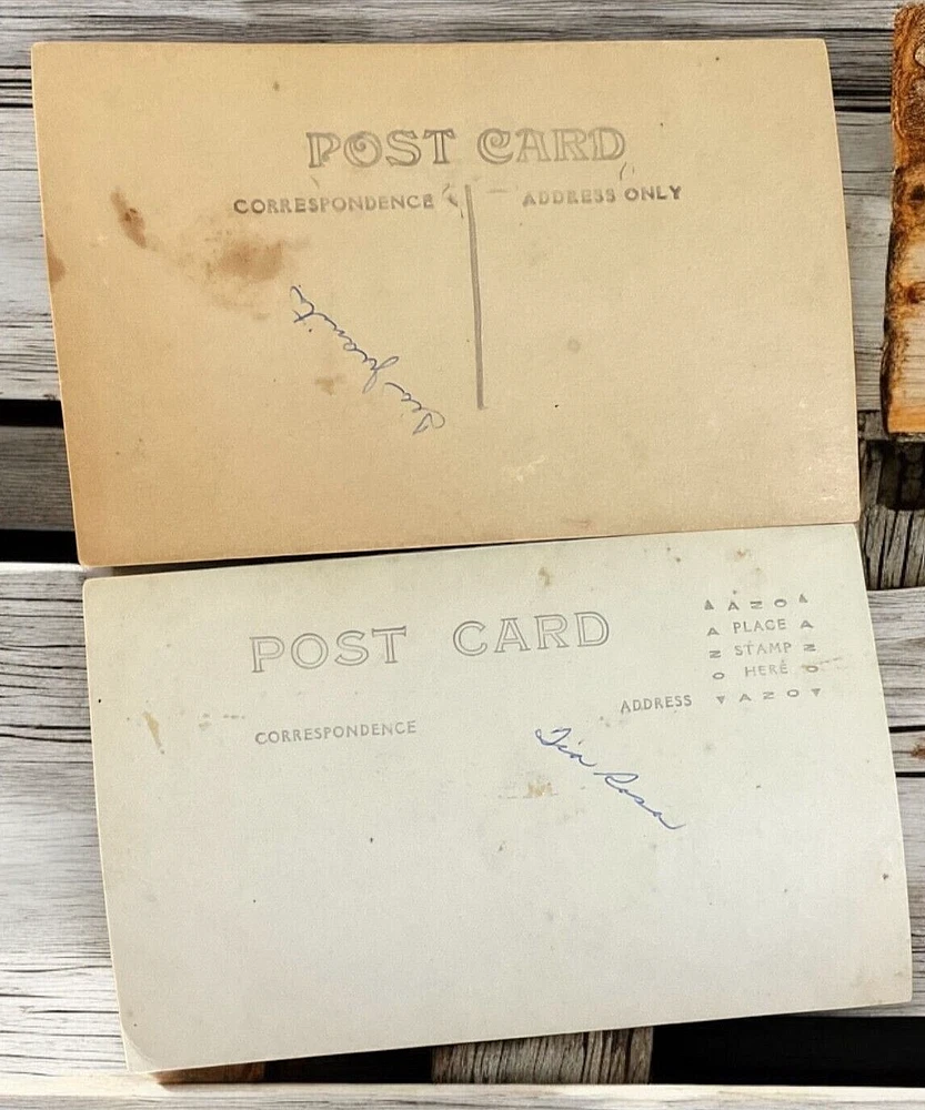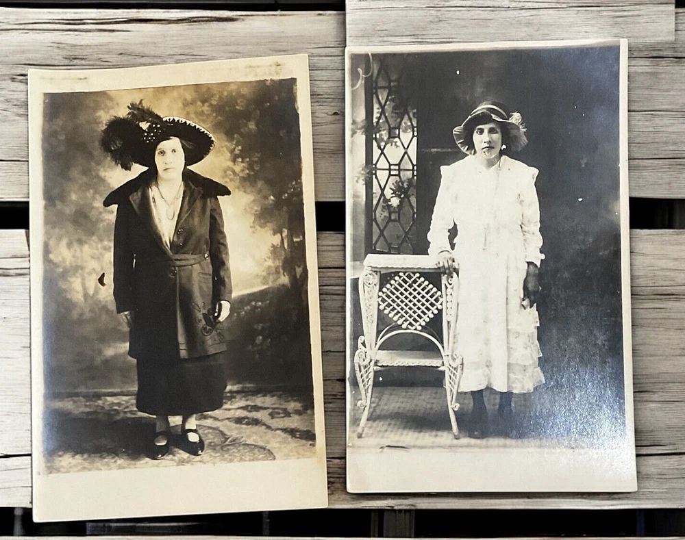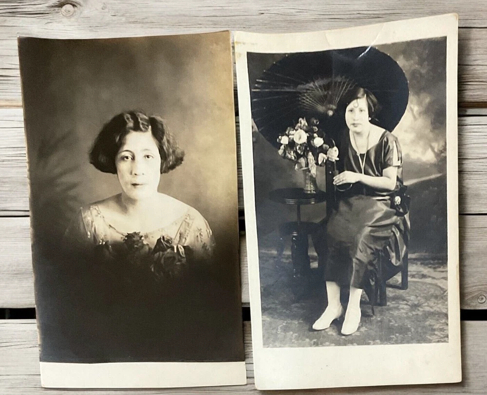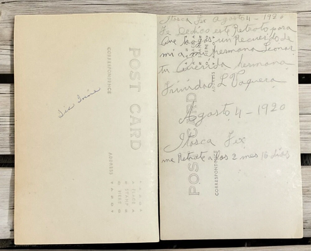 Lot of 11 RPPC's Real Photograph Post Cards of Hispanic Women & Girls dated 1920 - 1924 in Texas. Most photographs are black and white with a couple being sepia and are approximately 3-3/8" x 5-3/8". All cards have some degree of yellowing due age, slight bends/creasing, and stains/spanish writing on back. Photographs feature young and middle age Hispanic women posing with chairs/indoor and a couple are outdoor photo's.