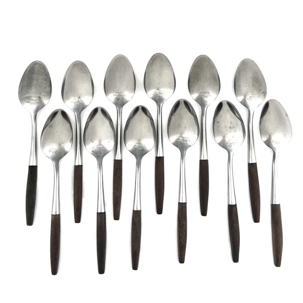 Offering a lot of 12 Interpur INR2 teaspoons 6.5” long, mid-century modern style, a discontinued pattern made in Japan. The brown synthetic handles are sturdy and have cracks, which look especially dark, having just been washed. The stainless steel is in good condition, no chips, dents, or disposal damage. There are surface scratches and wear consistent with normal use. Please view the photos for details and condition. Measurements and photo colors are approximate. For extra protection your items will be packed in plastic sleeves and shipped in a box. For combined shipping, request an invoice before paying. Shipping is your choice of USPS Ground Advantage or USPS Flat Rate Priority at the rate determined by eBay. Terms of Sale: Photos are of the actual item you will receive and is sold "as is". Placing an order is your agreement that you know what you are buying, have viewed the photos and find the condition acceptable. If you have any questions or concerns about your order, contact me through eBay Messages. Please inspect your item upon arrival and contact me if there are any problems so we may work out a solution, before you leave feedback or request a refund . No returns please.