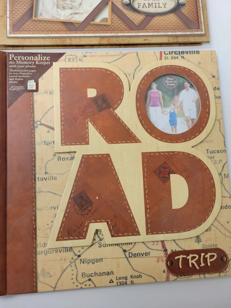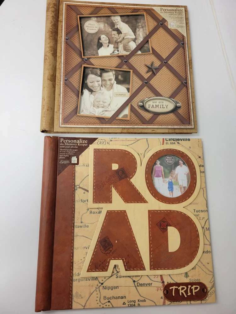 The product is a set of two brand new memory books designed for capturing family memories and road trip adventures. These 12x12 scrapbook albums feature a multi-color theme ideal for preserving cherished moments with loved ones. Handmade details are not specified, making these albums a convenient option for organizing and displaying photos and mementos from family gatherings and travel experiences. Perfect for those looking to create lasting keepsakes of special moments and adventures. Reduced shipping on multiple orders.