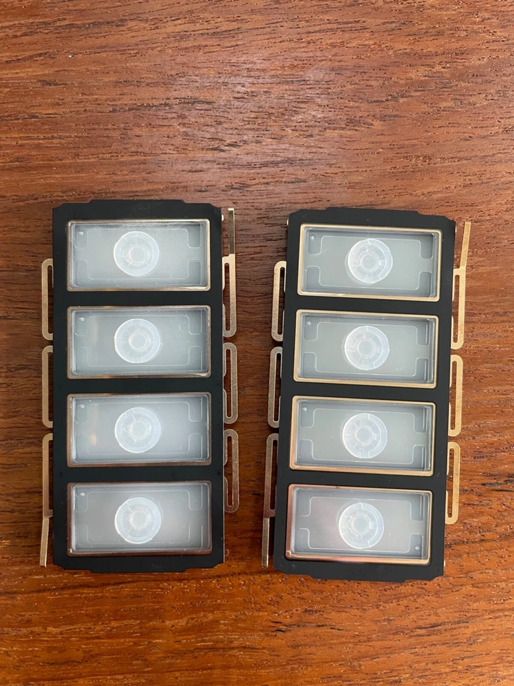 Lot of 2 Lutron Palladiom pre-engraved 4-button kit in Architectural Metal Polished Graphite. Exterior / Heaters / Shades / Evening. Breezeway / Exterior / Grill / Heaters. Slight scratches on the "Shades" button, but hardly visible. Button kit only.