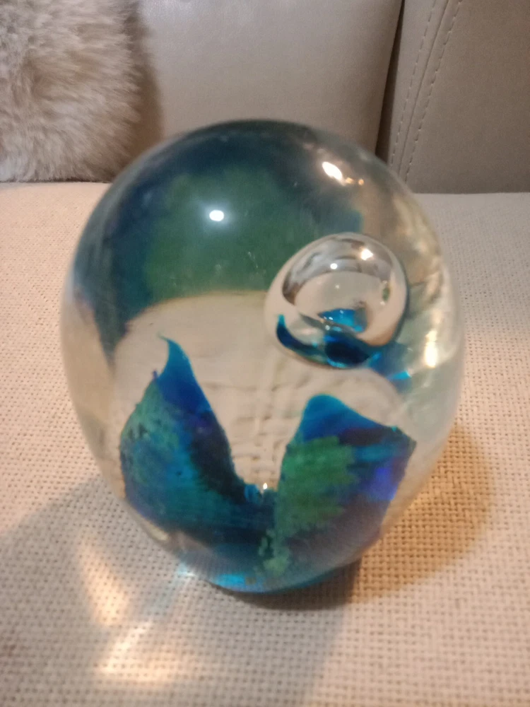 This lot of two modern art glass paperweights features a beautiful fish aquarium design, perfect for any lover of marine life. The larger paperweight stands at 4 inches tall and the smaller one at 3 inches, making them ideal for display on any shelf or desk. The multicolored glass and intricate production style of these paperweights make them true works of art. Crafted in the 1990s, these paperweights are unmarked and their era is unknown. They are, however, perfect for collectors of paperweights and those who appreciate unique and beautiful decorative items. Add a touch of the ocean to your home with this stunning pair of paperweights.