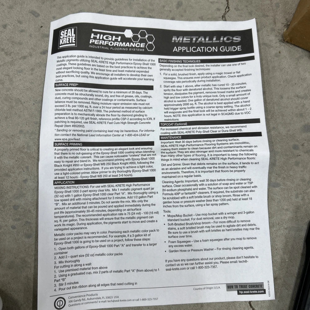 Color:Brushed AluminumContainer Size:12ozFeatures:High Traffic Areas, For Commercial Use, For Interior, For Outdoor Use, For Residential UseCalifornia Prop 65 Warning:WARNING: This product contains a chemical known to the State of California to cause birth defects or other reproductive harm. For more information go to www.P65Warnings.ca.gov.MPN:9832Brand:Seal KreteType:Interior/ExteriorRoom:Man Cave, Basement, GarageSheen:ShinySuitable For:Flooring