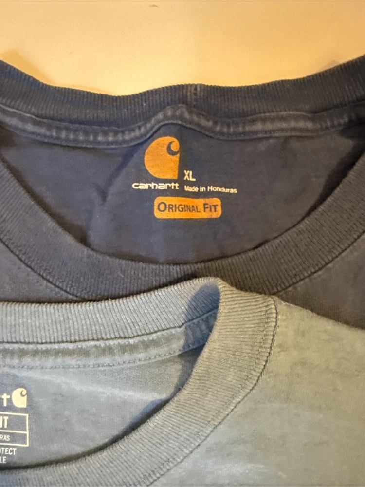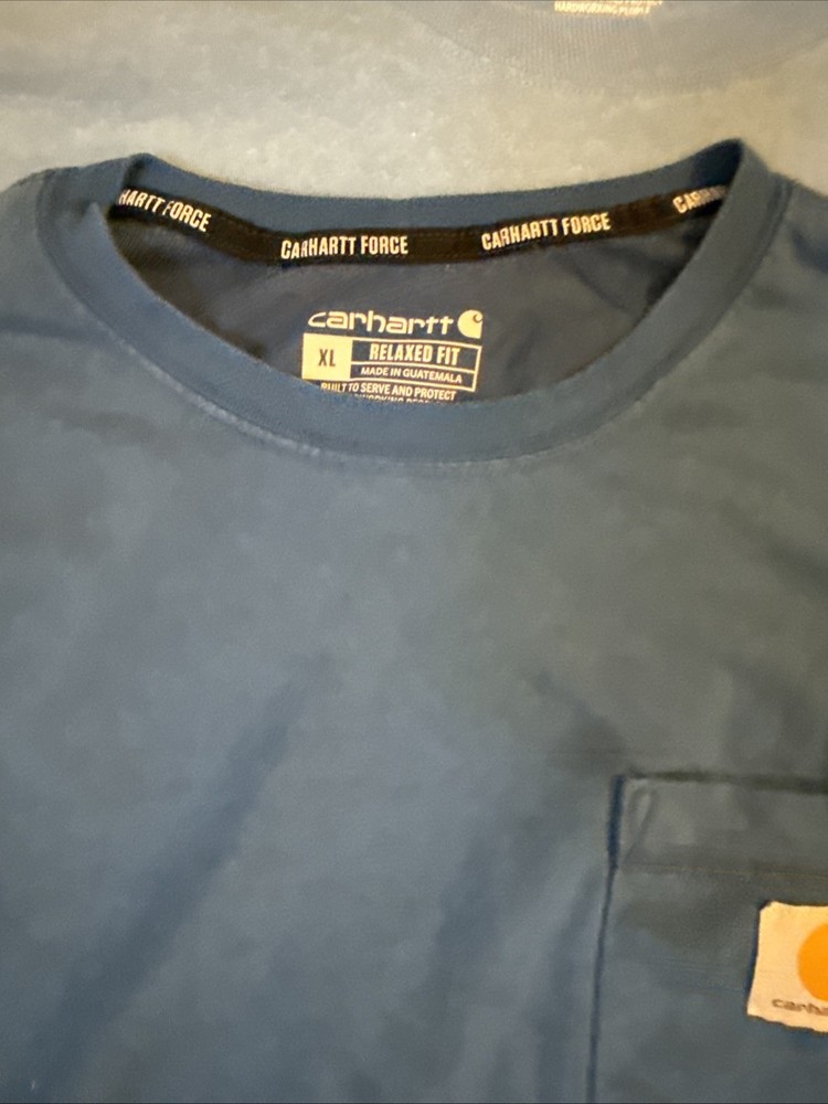 This lot includes 3 Carhartt K87 Loose Fit Heavyweight Pocket T-Shirts in men's size XL. Made of sturdy cotton knit material, these solid blue shirts feature a crew neck and short sleeves, ideal for summer, fall, and spring wear. The heavyweight construction and pockets add practicality to the design, making them a versatile and comfortable option for everyday wear. The Carhartt brand ensures quality and durability, while the machine washable fabric makes for easy care and maintenance.