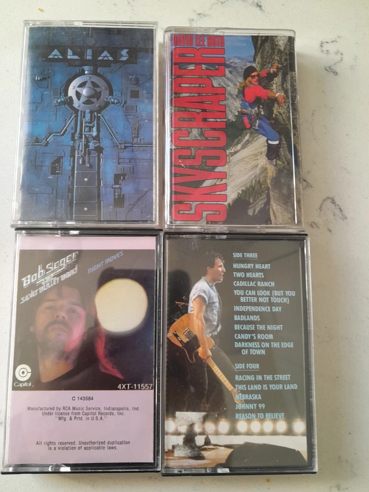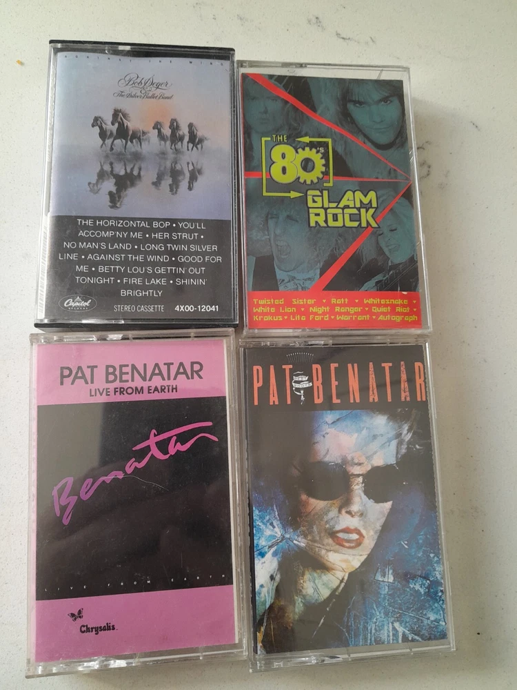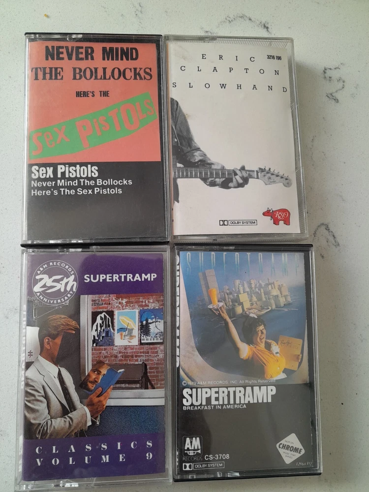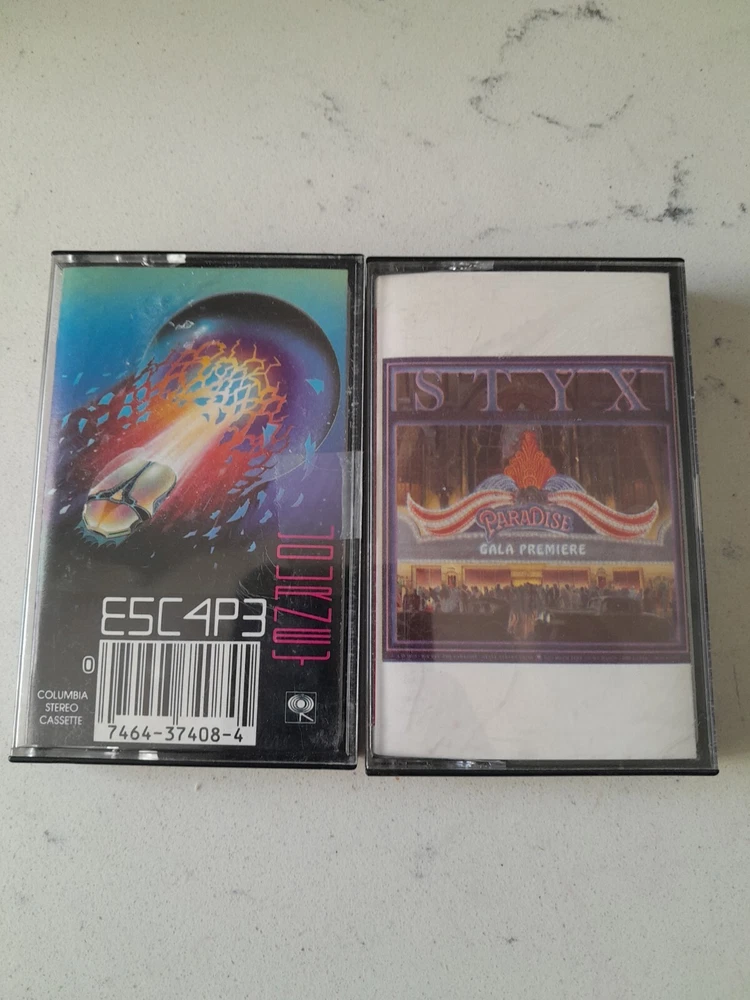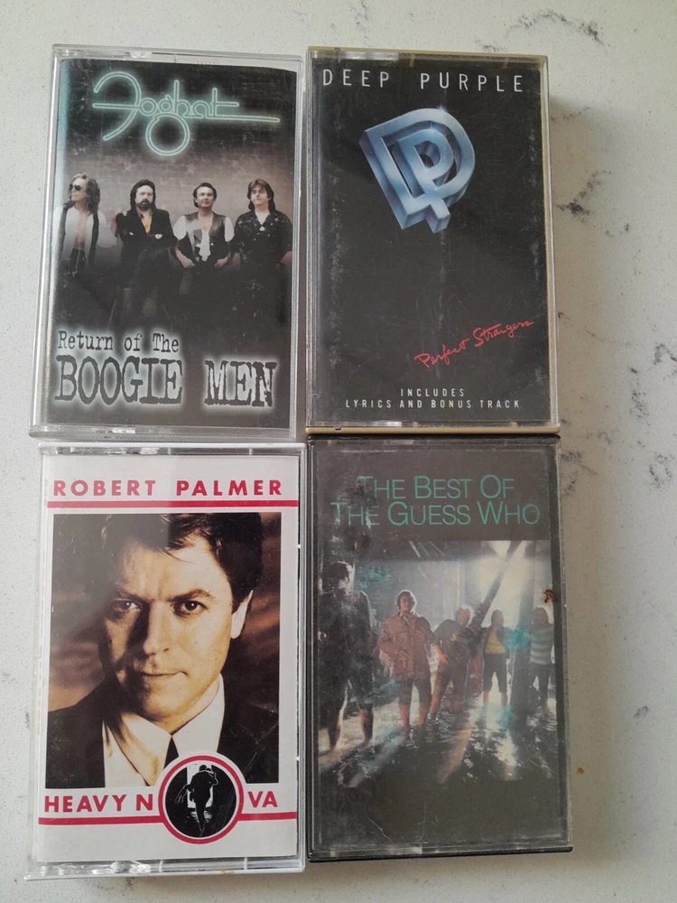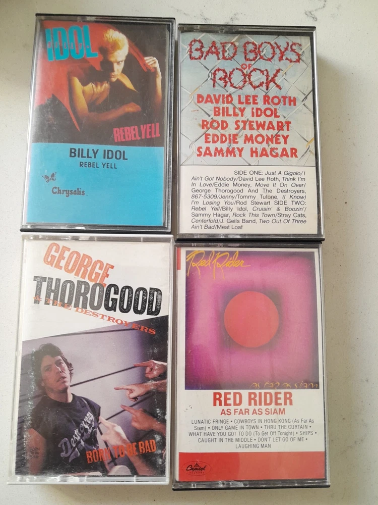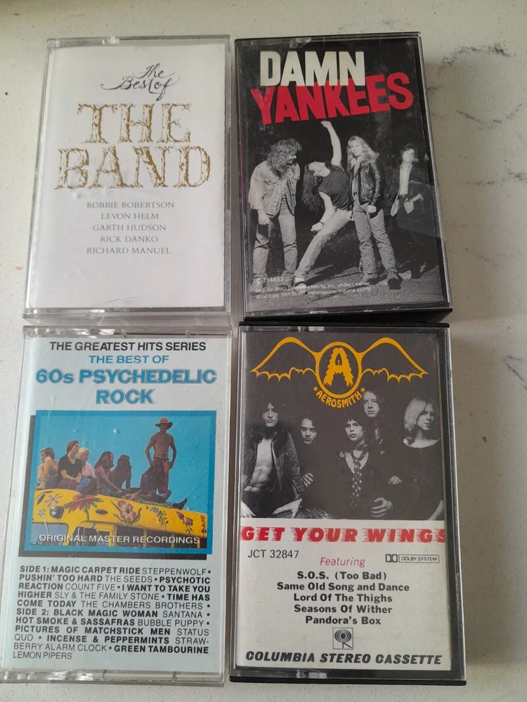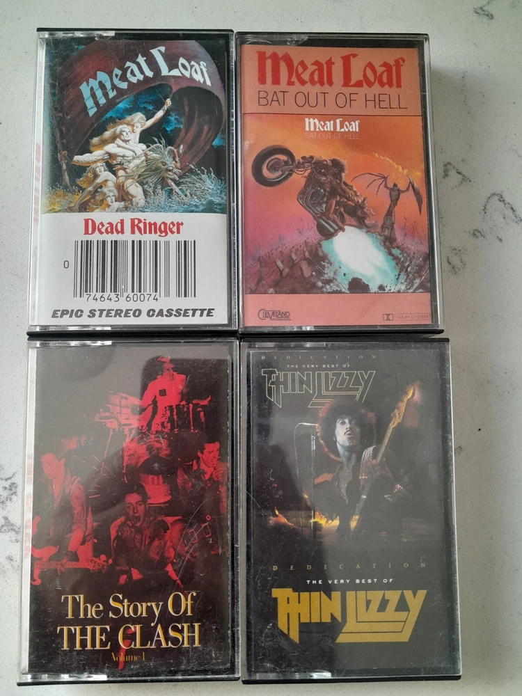 Lot of 34 Cassette Tapes featuring classic artists from the 60s, 70s, and 80s such as Meatloaf, The Clash, Journey, and Aerosmith. The music style is Hard Rock with genres including Acid Rock, Rock, Rock 'n' Roll, and Metal. The cassettes are in Very Good condition with Good inlay, all in English language. The color of the cassettes is Pink.