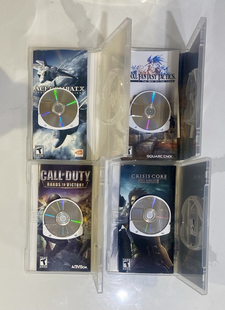 Lot of 4 Used PSP Games: Final Fantasy Tactics: The War of the Lions (Sony PSP, 2007) . Crisis Core: Final Fantasy VII 7 (Sony PSP, 2008). Call of Duty: Roads to Victory (Sony PSP) . & Ace Combat X Skies Deception (Sony PSP). Games are complete with disc, manual, and case. Discs are in good condition. Please refer to photos for more details. ****ALL GAMES TESTED & WORKING****