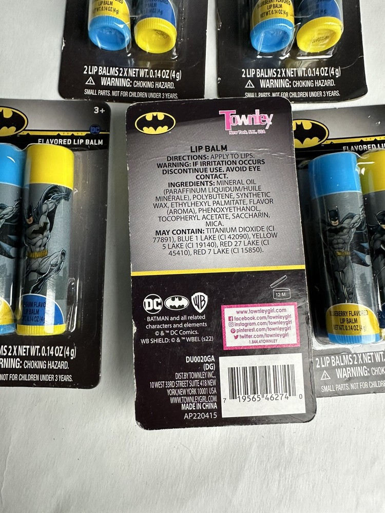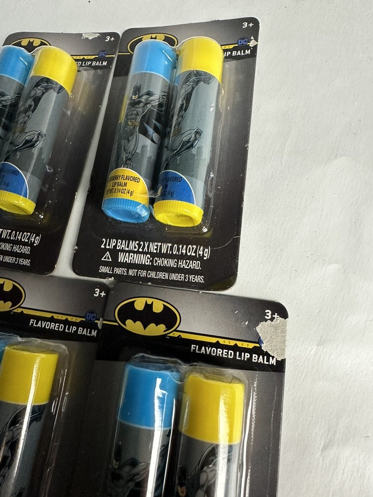 Lot of 5 Twin Pack Batman Flavored Lip Balm Blueberry and Bubble Gum. Boxes may have slight tears where price tags used to be Box 58