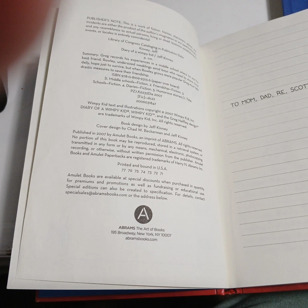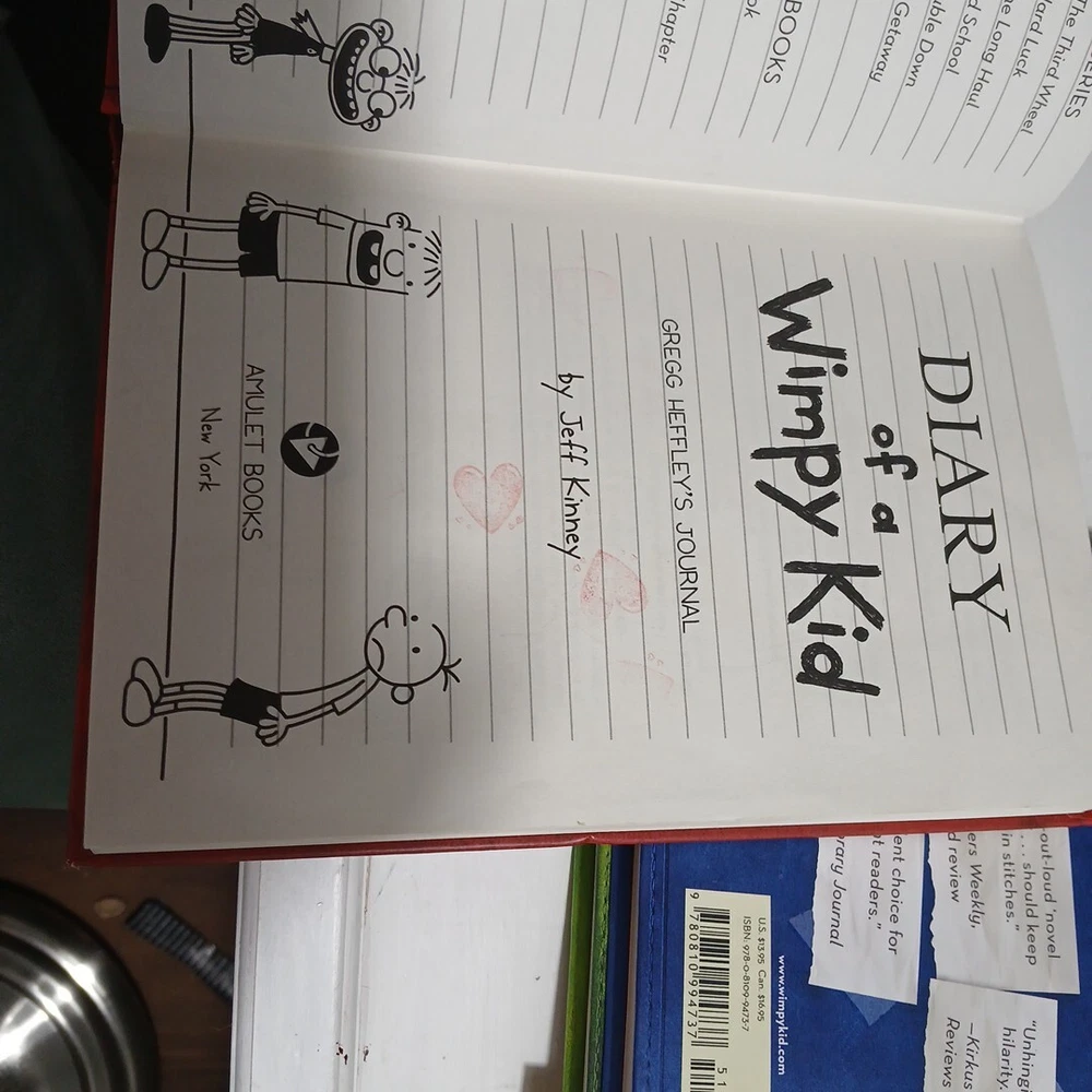 Personalized:NoOriginal Language:EnglishEx Libris:NoSigned:NoBook Title:Diary of a Wimpy KidPersonalize:NoVintage:YesNarrative Type:Fictiongtin13:N/AItem Length:8 inBook Series:Diary of a Wimpy KidISBN:N/AInscribed:NoPublication Year:2008Item Weight:70 ozCountry/Region of Manufacture:United StatesItem Width:4.5 inFormat:HardcoverLanguage:EnglishTopic:BooksAuthor:Jeff KinneyPublisher:Amulet BooksGenre:Children & Young Adults