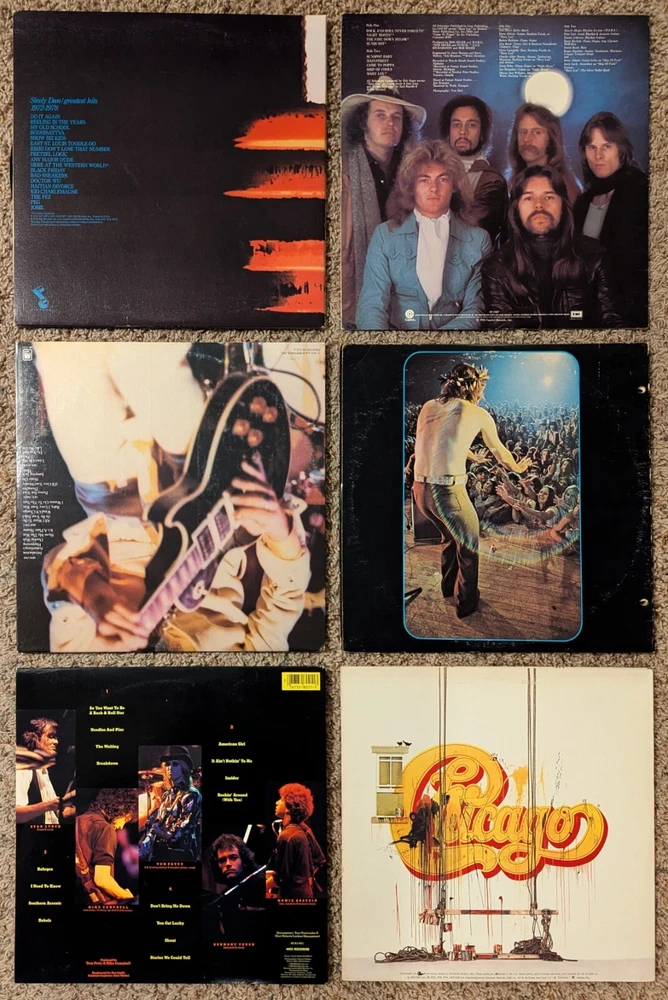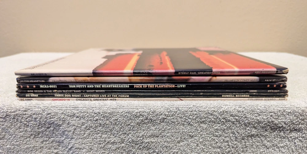 This listing is for the following 6 vinyl LP albums (9 total records, 12" 33 RPM): Steely Dan - Greatest Hits (1978, AK-1107/2) *2 records* Peter Frampton - Frampton Comes Alive! (1976, SP-3703) *2 records* Tom Petty and the Heart Breakers - Pack Up the Plantation-Live! (1985, MCA2-8021) *2 records* Bob Seger and The Silver Bullet Band - Night Moves (1976, ST-11557) Three Dog Night - Captured Live at the Forum (1969, DS 50068) Chicago - Chicago's Greatest Hits (1975, PC 33900) Records are in nice condition with no warping and include jackets and inner sleeves. Jacket for Three Dog Night has holes punched in the left side.