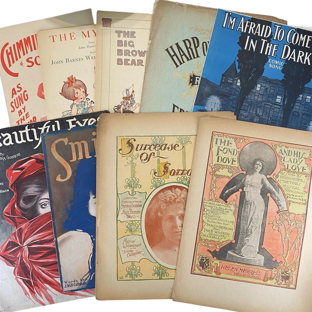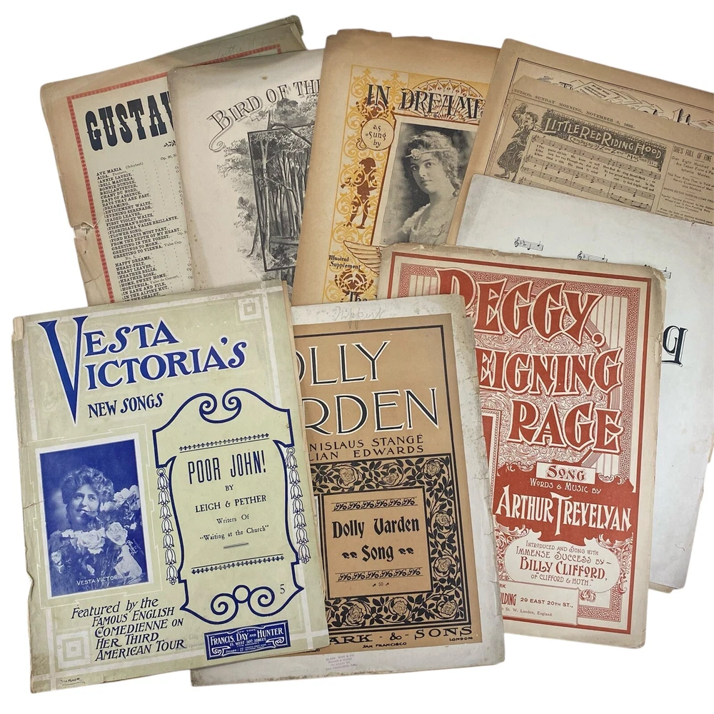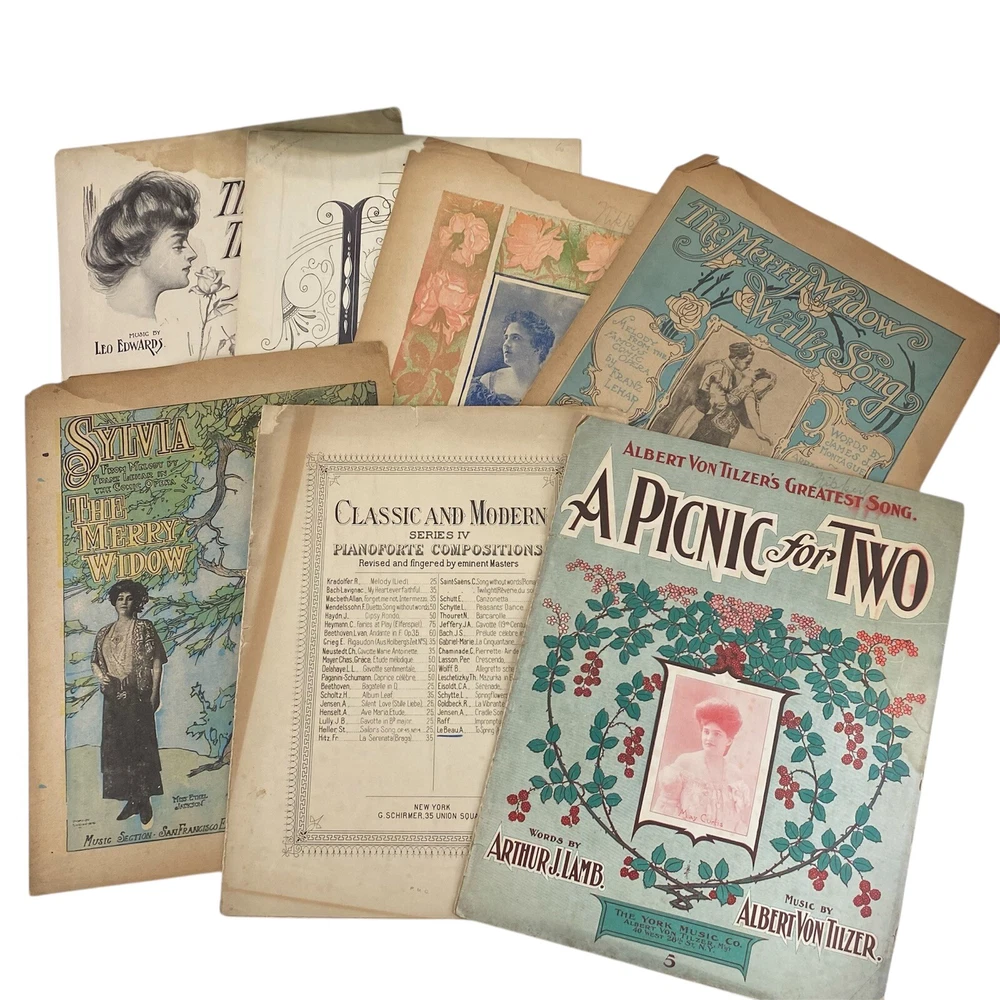 Dive into a treasure trove of musical history with this extensive lot of over 90 vintage sheet music pieces. Signs of wear, stains, rips present. Each piece is a testament to the golden age of piano vocals and musicals, offering a unique glimpse into the past with its very worn pages telling stories of performances and practices. The collection features an eclectic mix, showcasing a wide range of genres and composers. It's an ideal find for collectors, musicians, or anyone with an appreciation for the tactile beauty of analog music. Whether for performance, display, or research, these sheets are a tangible link to musical heritage.