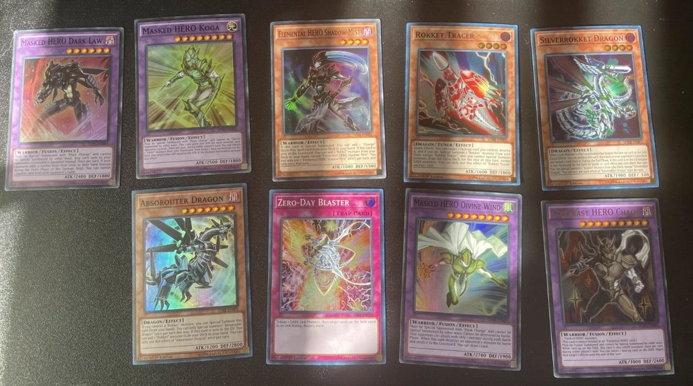 Nine holo/shiny Yu-Gi-Oh cards. I don't really know anything about Yu-Gi-Oh, so yeah. They all seem to be in good condition. Please review the images.