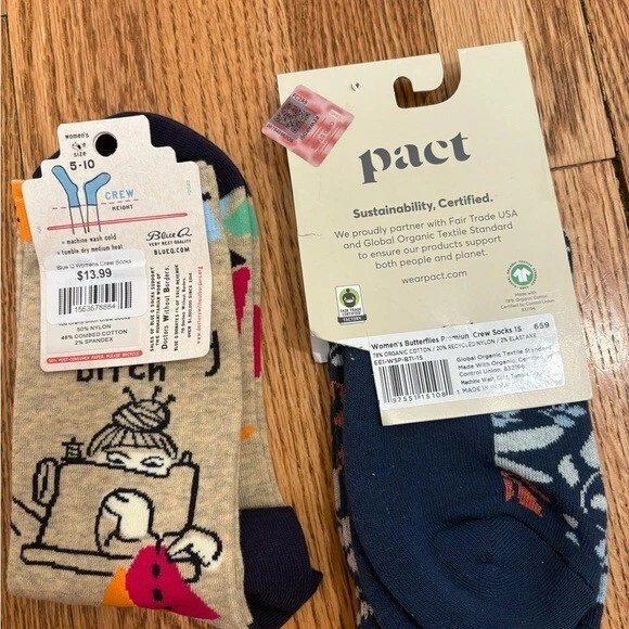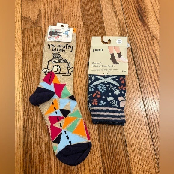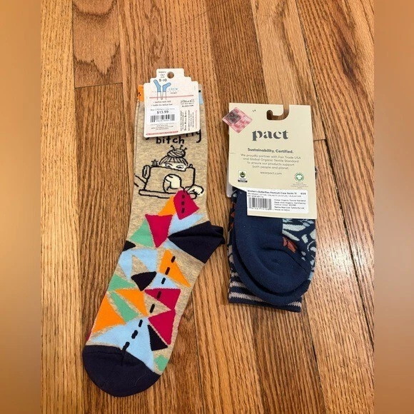This lot of women's socks by Pact includes 6-10 pairs of gorgeous cotton crew socks in blue and orange hues. The mid-calf length socks feature a full toe design and are machine washable for easy care. Perfect for the winter and fall seasons, these colorful and novelty-themed socks are brand new and designed to add a fun touch to your outfit.