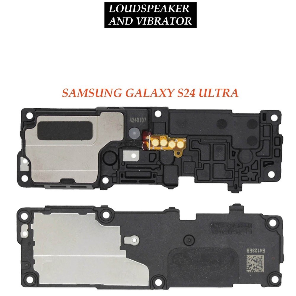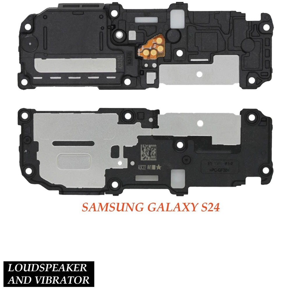 The product is a black loudspeaker and vibrator unit specifically designed for Samsung Galaxy S24, S24 Plus, S24 Ultra, and S24 FE models. This unit is compatible with the specified Samsung devices and includes one piece in the packaging. This replacement part is essential for ensuring the proper functionality of the phone's sound and vibration features, providing a seamless user experience for those who require a high-quality replacement option for their Samsung smartphone.